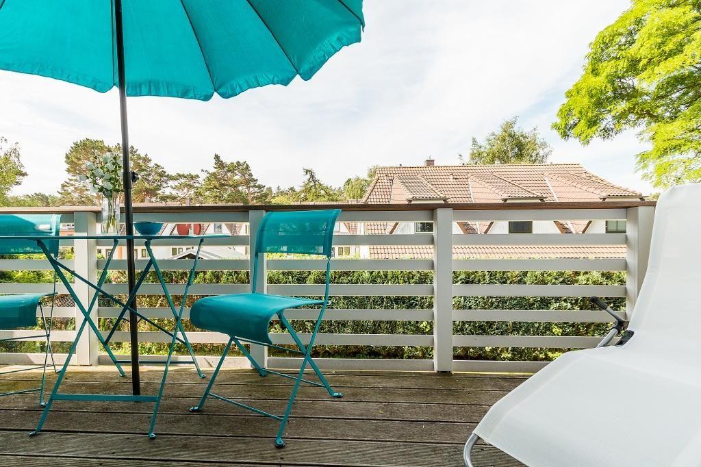 Im Außenbereich steht dir der Südbalkon mit passender Bestuhlung, einer Sonnenliege und Sonnenschirm zur Verfügung. Mit Blick über die Dächer der Nachbarschaft kannst du die Ruhe genießen - wie man es sich im Urlaub wünscht.
