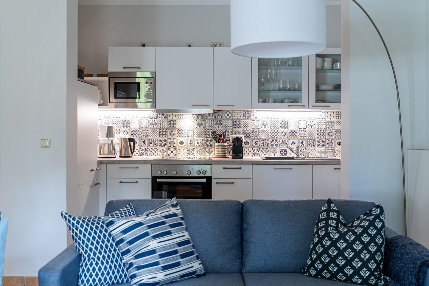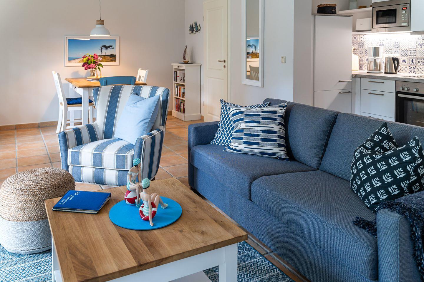 Die liebevoll eingerichtete Ferienwohnung „Glück“ ist durch maritimes Design und eine hochwertige Ausstattung geprägt. Der Wohnraum mit seinem gemütlichen Sofa und großen TV, der komfortabel ausgestatteten Küche und dem lieblich gestalteten Essbereich ist das Herzstück der Wohnung. Farben inspiriert von Himmel und Meer, natürliche Materialien und lichtdurchflutete Räume sorgen in der gesamten Wohnung für ein traumhaft schönes Urlaubs-Feeling. So auch im Schlafzimmer, das mit seinem hochwertigen Boxspringbett einen erholsamen Schlaf und heimeligen Rückzugsort garantiert. Das Badezimmer beinhaltet klassisch Dusche, WC und Handtuchhalter und rundet den Wohnkomfort für zwei oder drei Personen mit und ohne Hund ab. „Glück“ für jeden, der hier seinen Urlaub verbringt.