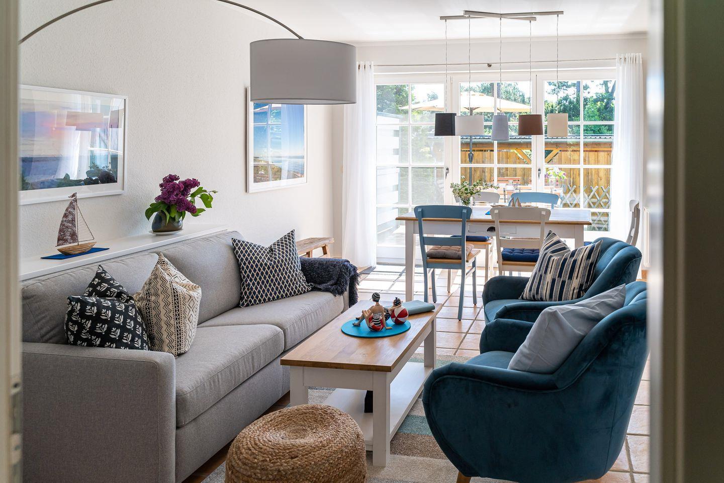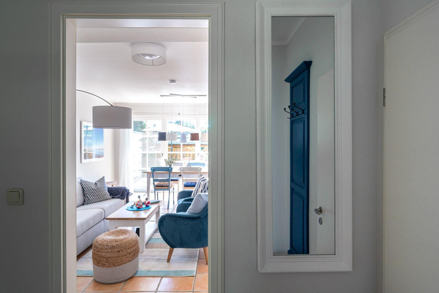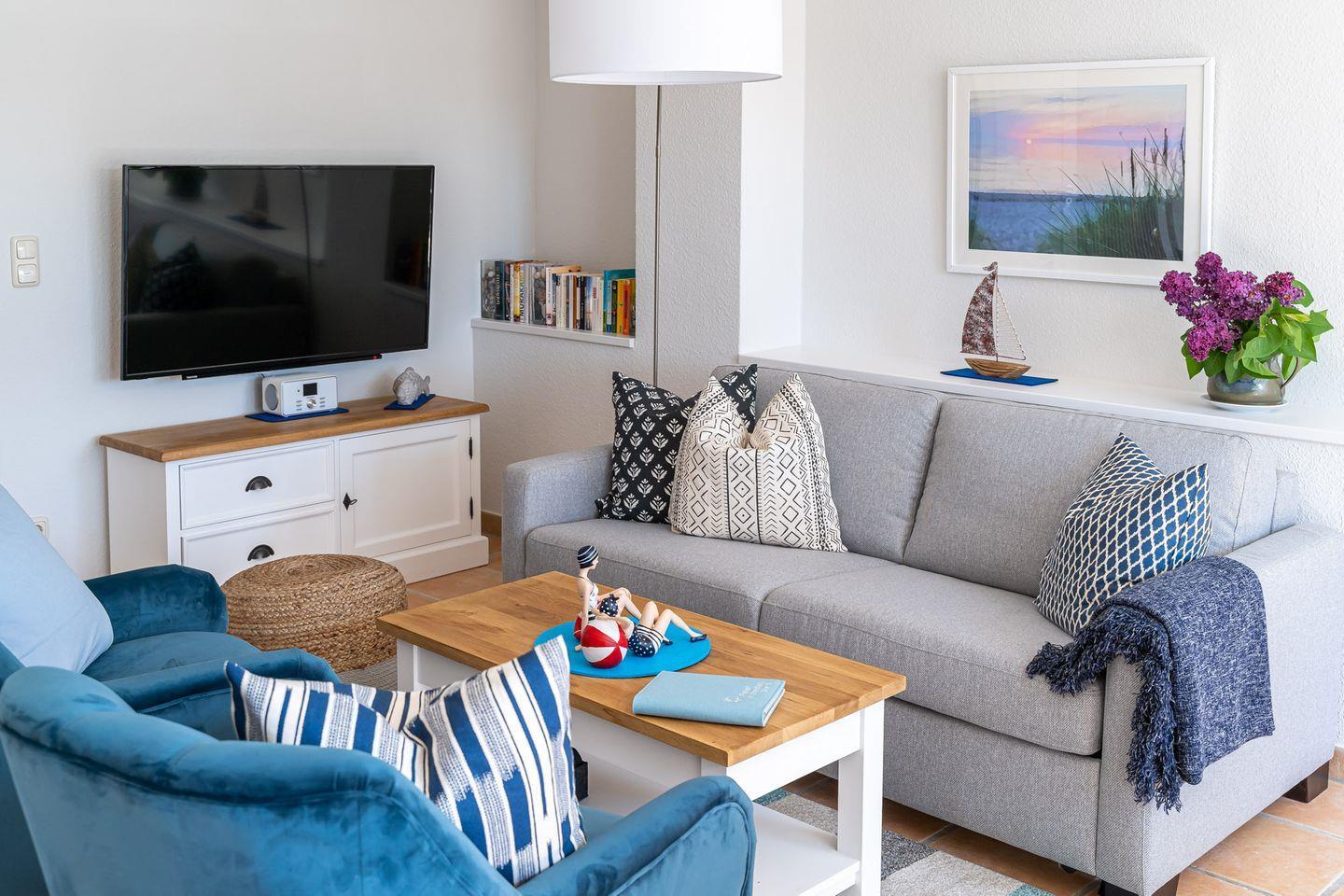 Nur 50 Meter vom Strand entfernt, ist die Maisonette-Ferienwohnung „Freiheit“ ein Refugium für Natur- und Strandsuchende. Die Nähe zu Meer, Sand und Muscheln finden sich überall in den Farben wieder. Weißes, graues und blaues Interieur ist harmonisch aufeinander abgestimmt und versetzt einen sofort in Urlaubs-Feeling. Über die Terrasse geht’s in den Eingang und lichtdurchfluteten Wohnbereich. Mit seiner separaten Sofa- und TV-Ecke, der topmodernen Küche, dem sonnigen Esstisch und Zugang zur zweiten Terrasse ist der großzügige Wohnbereich zweifelsohne das Herzstück dieser wunderschönen Wohnung. Auch eins der zwei Badezimmer mit Dusche und WC befindet sich im Erdgeschoss. Über die Holztreppe gelangt man in die beiden Schlafzimmer, die dank der komfortablen Boxspringbetten und je einem TV pure Gemütlichkeit ausstrahlen. Ein zweites, ästhetisches Badezimmer mit integrierter Sauna macht den Urlaubskomfort perfekt. Gerade an kälteren Tagen kann man sich hier ganz sich selbst widmen - neue Energie tanken und müde Lebensgeister wecken. Was für eine tolle Auszeit.