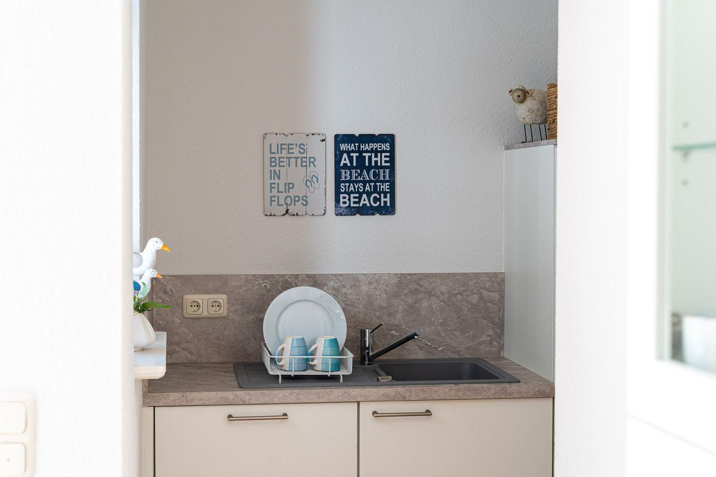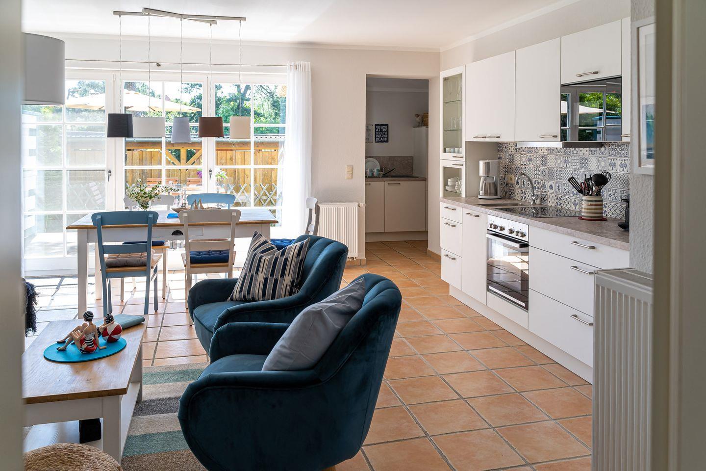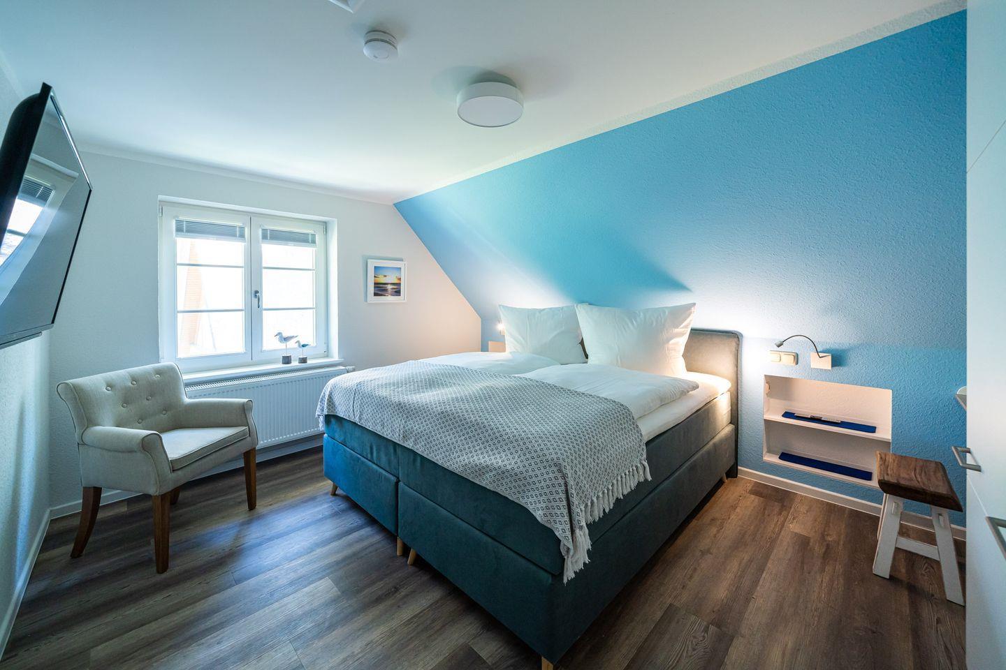 Nur 50 Meter vom Strand entfernt, ist die Maisonette-Ferienwohnung „Freiheit“ ein Refugium für Natur- und Strandsuchende. Die Nähe zu Meer, Sand und Muscheln finden sich überall in den Farben wieder. Weißes, graues und blaues Interieur ist harmonisch aufeinander abgestimmt und versetzt einen sofort in Urlaubs-Feeling. Über die Terrasse geht’s in den Eingang und lichtdurchfluteten Wohnbereich. Mit seiner separaten Sofa- und TV-Ecke, der topmodernen Küche, dem sonnigen Esstisch und Zugang zur zweiten Terrasse ist der großzügige Wohnbereich zweifelsohne das Herzstück dieser wunderschönen Wohnung. Auch eins der zwei Badezimmer mit Dusche und WC befindet sich im Erdgeschoss. Über die Holztreppe gelangt man in die beiden Schlafzimmer, die dank der komfortablen Boxspringbetten und je einem TV pure Gemütlichkeit ausstrahlen. Ein zweites, ästhetisches Badezimmer mit integrierter Sauna macht den Urlaubskomfort perfekt. Gerade an kälteren Tagen kann man sich hier ganz sich selbst widmen - neue Energie tanken und müde Lebensgeister wecken. Was für eine tolle Auszeit.