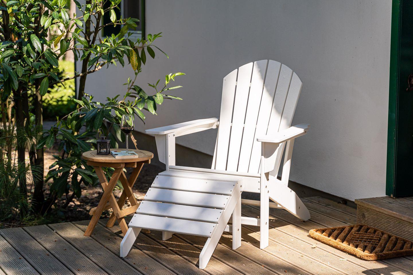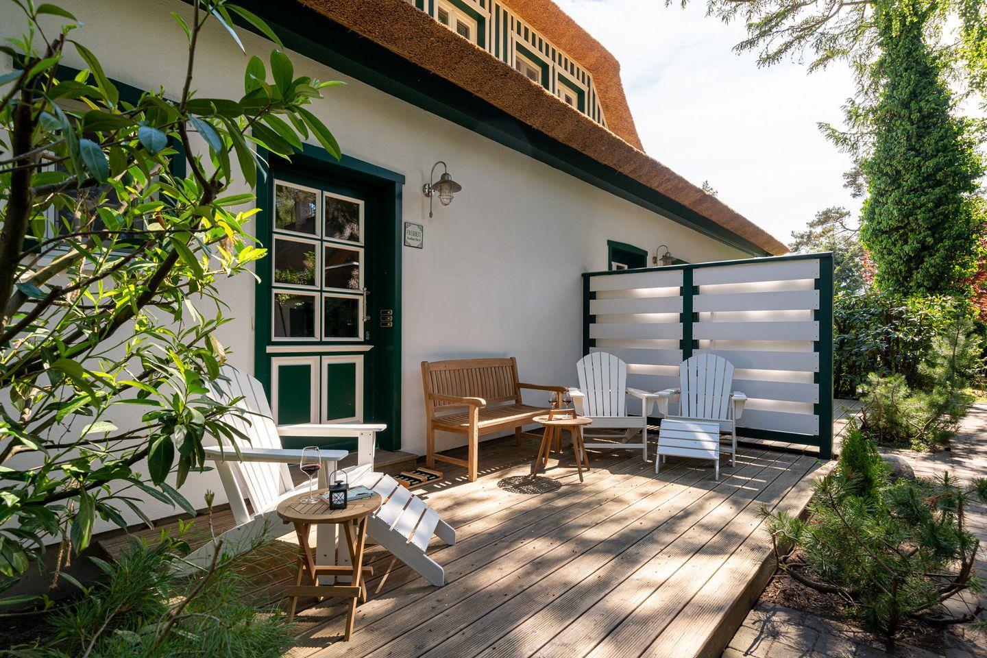 Der Außenbereich hält zwei großzügige Holzterrasse mit Liegestühlen, Sonnenschirmen und kleinen Garten bereit. Nach einem ausgiebigen Urlaubstag kann man hier ganz privat für sich entspannen - unter freiem Himmel, im Hintergrund das sanfte Murmeln des Meeres und mit Blick in die grüne Umgebung, in der vielleicht gerade ein Reh vorbeizieht.