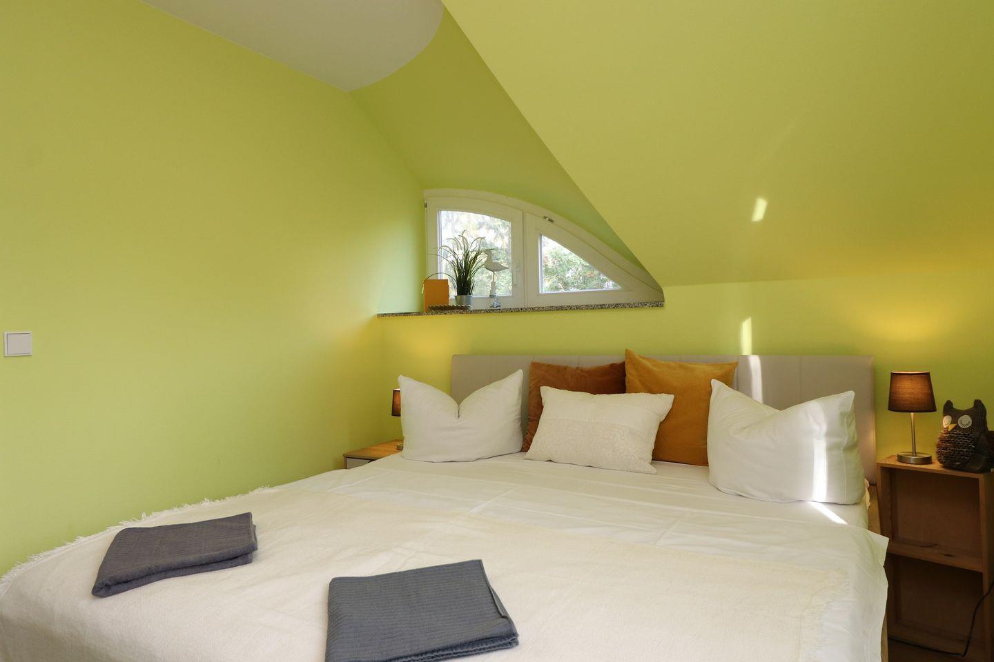 Im Obergeschoss befinden sich drei Schlafzimmer, die ausreichend Platz für erholsame Nächte bieten: ein Schlafzimmer mit Doppelbett, eines mit zwei Einzelbetten sowie ein weiteres mit Tandembett – ideal für Familien oder gemeinsam reisende Freunde. Ein weiteres Badezimmer mit Dusche und WC ergänzt die Ausstattung.