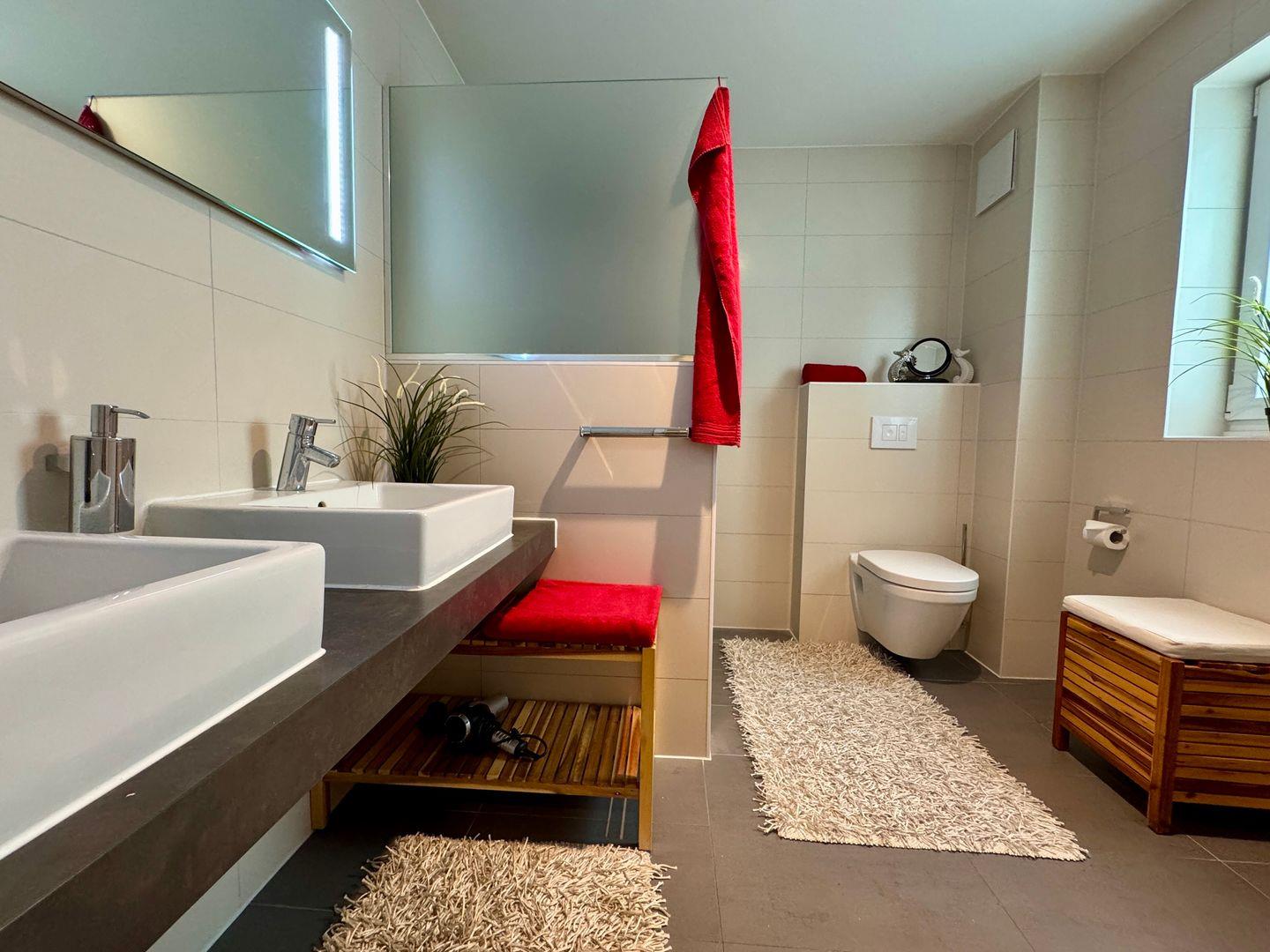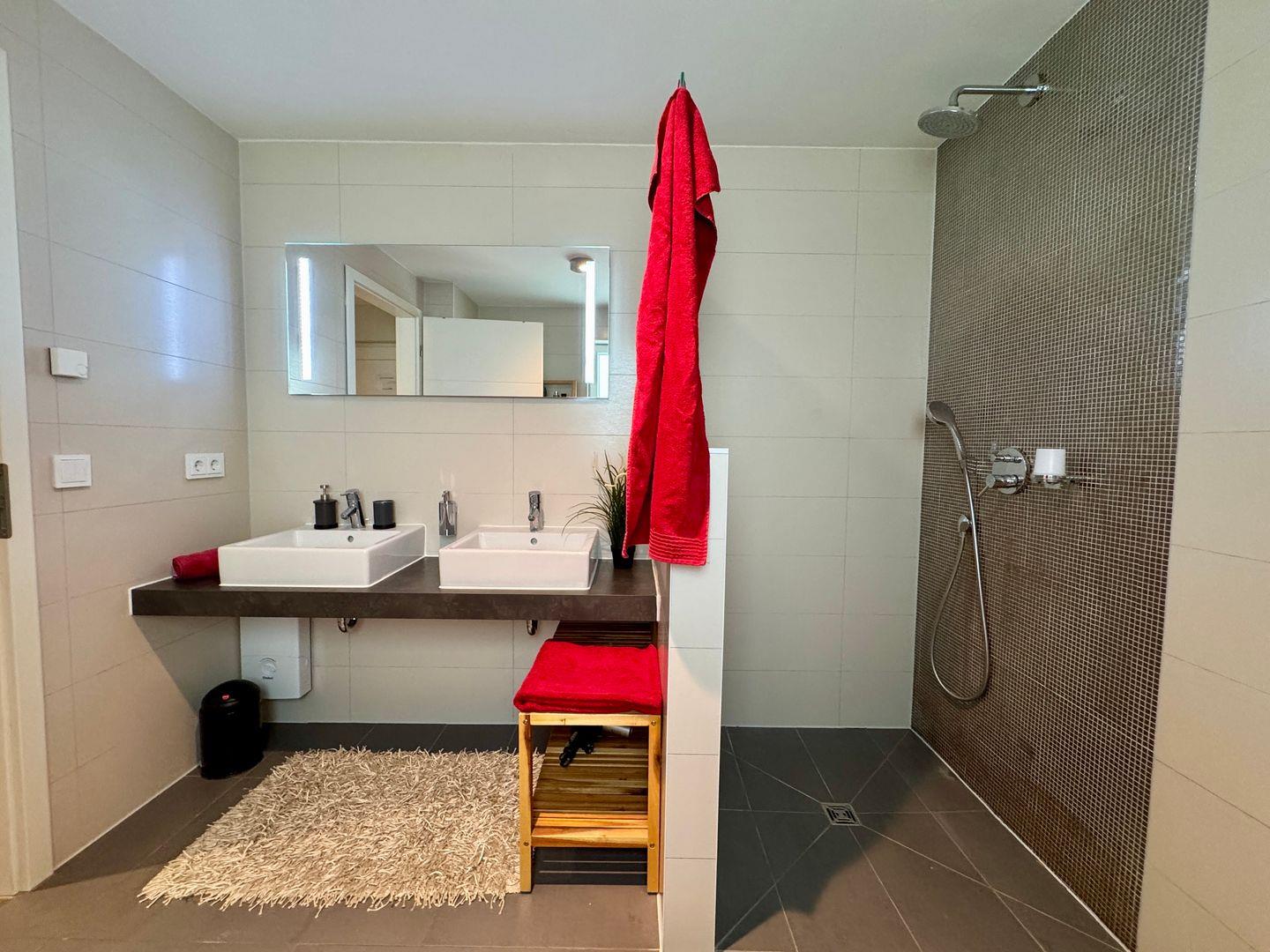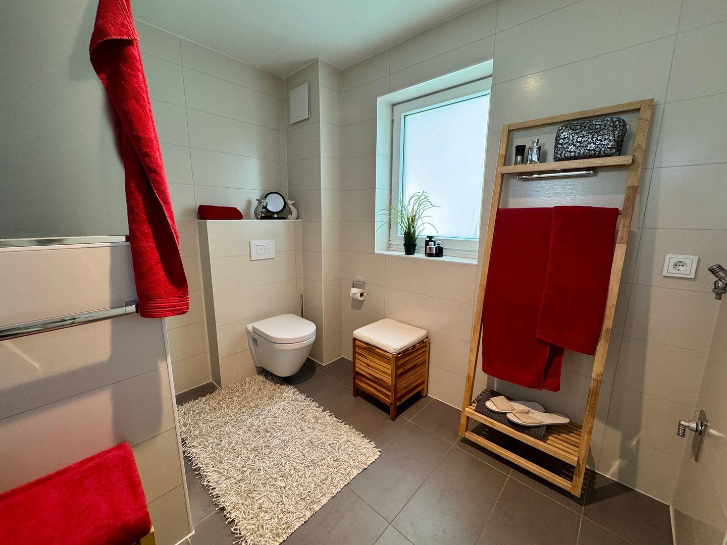 Das moderne Badezimmer ist mit Dusche, WC, Waschmaschine und Trockner ausgestattet und bietet damit zusätzlichen Komfort während Ihres Aufenthalts.
