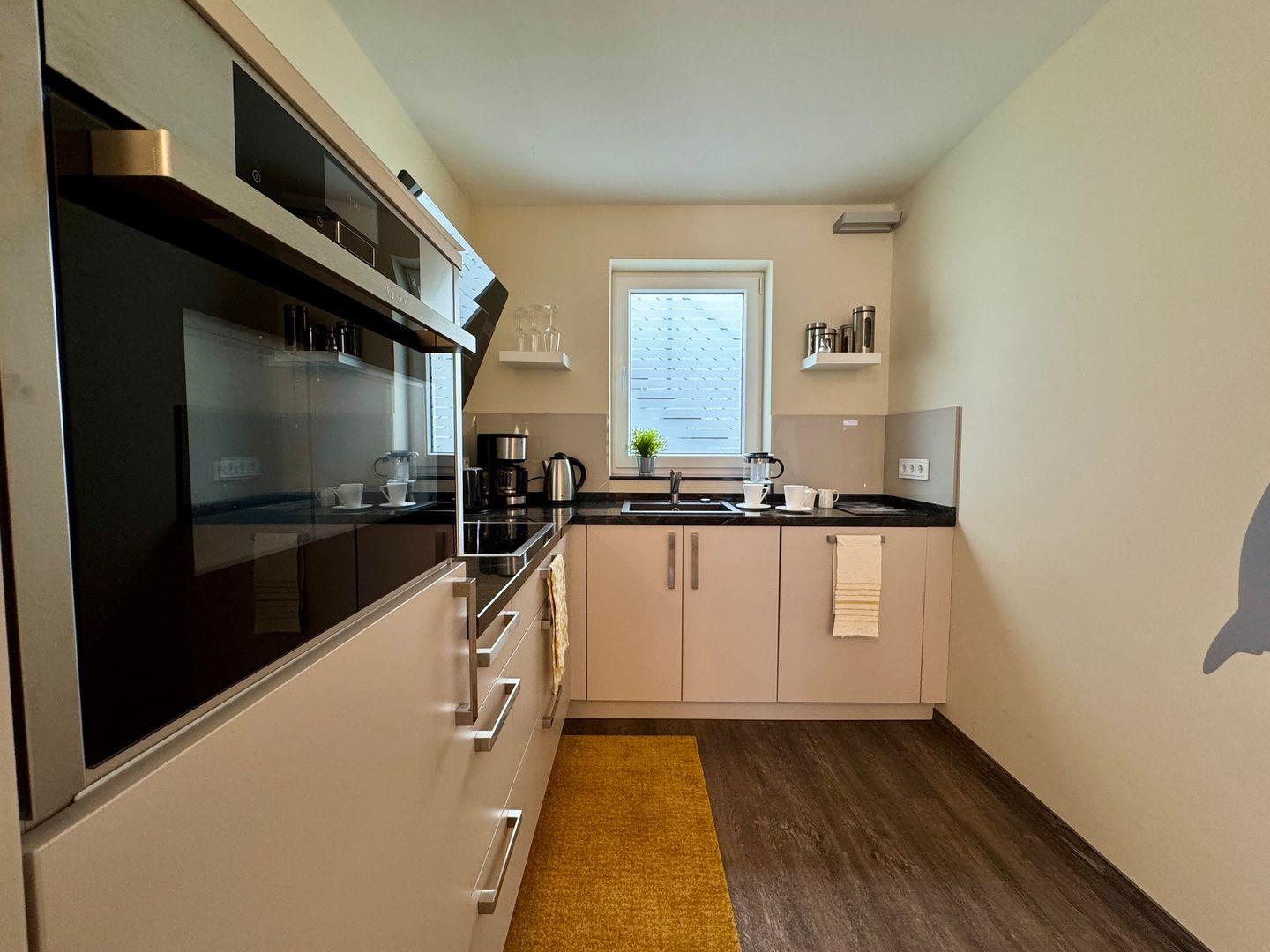 Der helle Wohnbereich lädt mit einer gemütlichen Sitzecke zum Verweilen ein. Eine Schlafcouch bietet zusätzliche Schlafmöglichkeiten für eine dritte Person. Die offene Küche ist praktisch ausgestattet und bietet alles, was Sie für die Zubereitung Ihrer Mahlzeiten benötigen – perfekt für ein entspanntes Frühstück oder ein gemeinsames Abendessen.