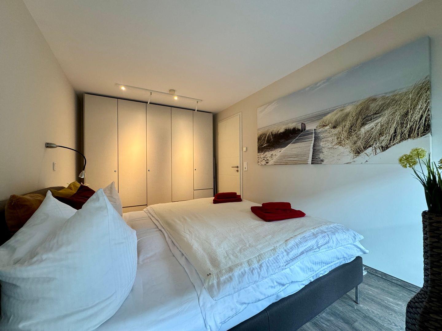 Das separate Schlafzimmer mit komfortablem Doppelbett sorgt für erholsame Nächte und bietet einen ruhigen Rückzugsort nach einem erlebnisreichen Tag an der Ostseeküste.