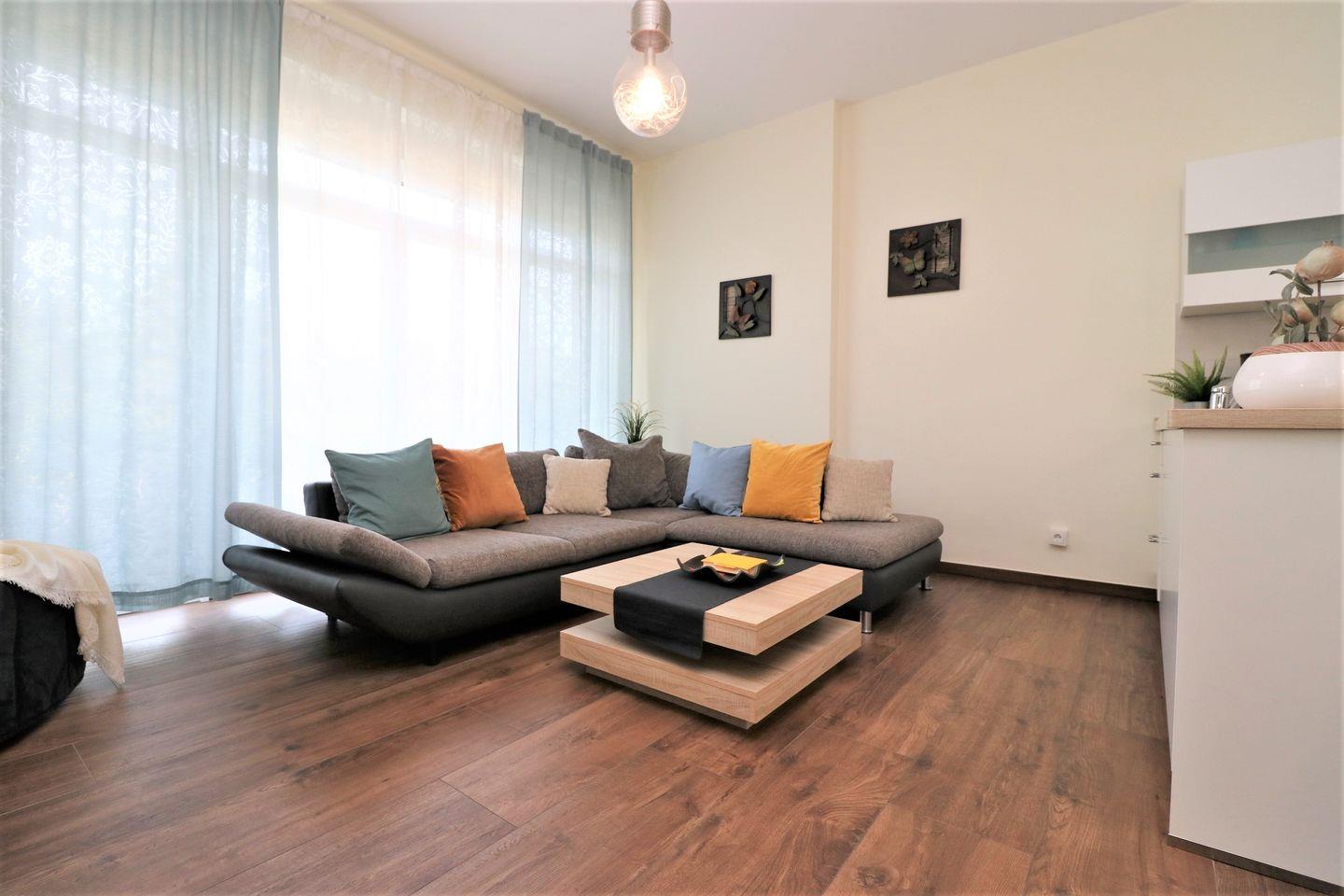 Der Wohnbereich lädt mit einer gemütlichen Sitzecke zum Verweilen ein. Eine bequeme Schlafcouch (120 cm breit) bietet bei Bedarf eine zusätzliche Schlafmöglichkeit. Die praktische Küchenzeile ist mit allem ausgestattet, was Sie für die Zubereitung Ihrer Mahlzeiten benötigen – ideal für ein entspanntes Frühstück oder ein gemeinsames Abendessen.