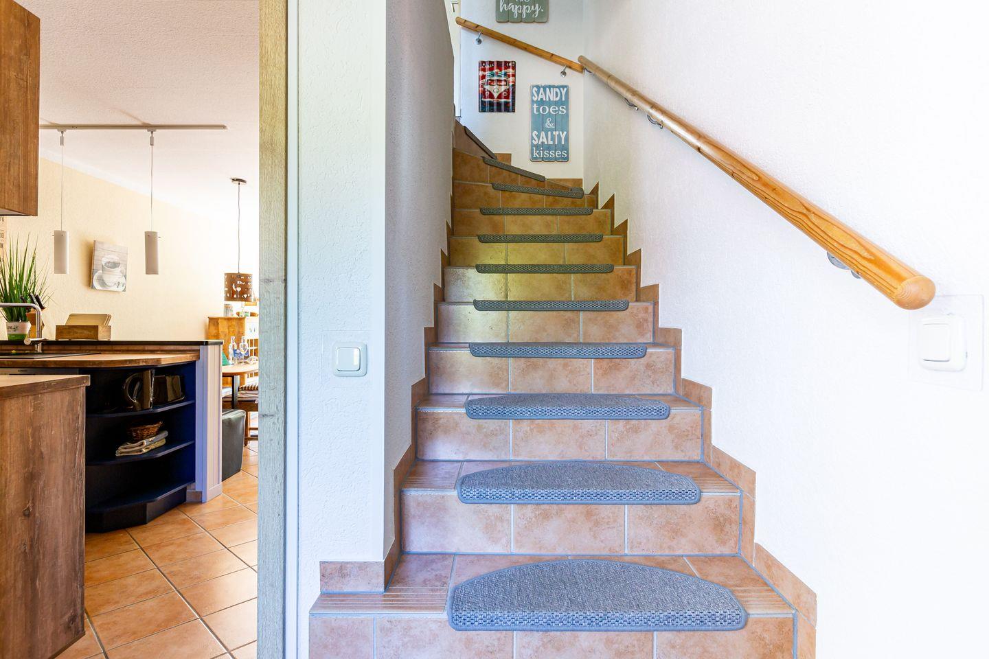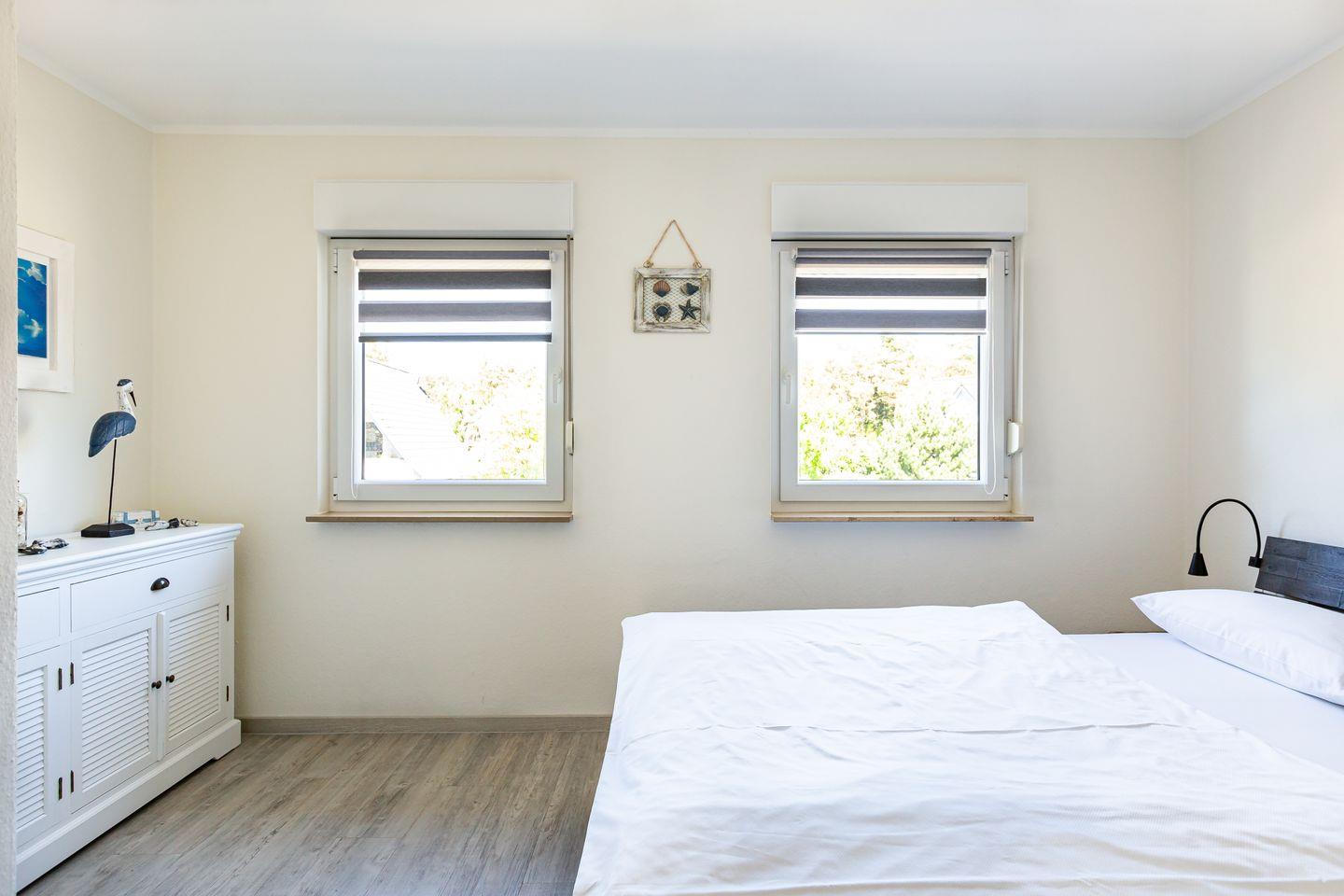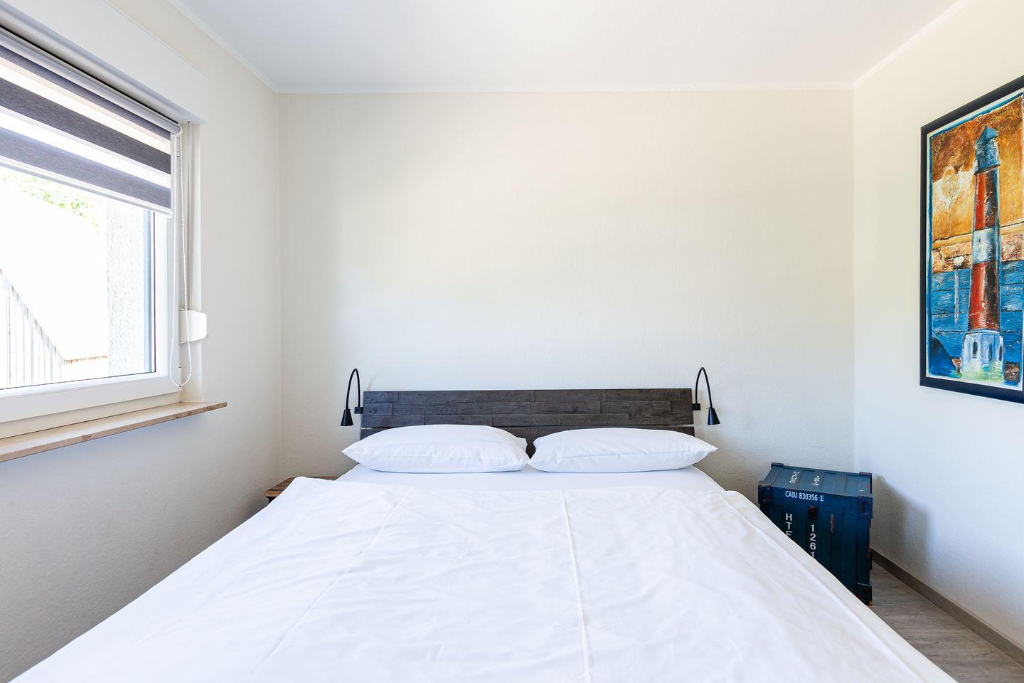Über die Treppe gelangt man in den ersten Stock und in die beiden Schlafzimmer der Wohnung. Beide sind mit einem hochwertigen Doppelbett, Kleiderschrank und Vorhängen ausgestattet, so dass man hier den erholsamen Schlaf und heimeligen Rückzugsort bekommt, den man sich im Urlaub wünscht. Für noch mehr Wohnkomfort verfügt auch diese Etage über ein Bad mit Dusche, WC und Waschmaschine.