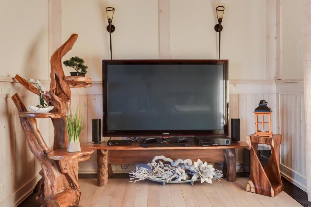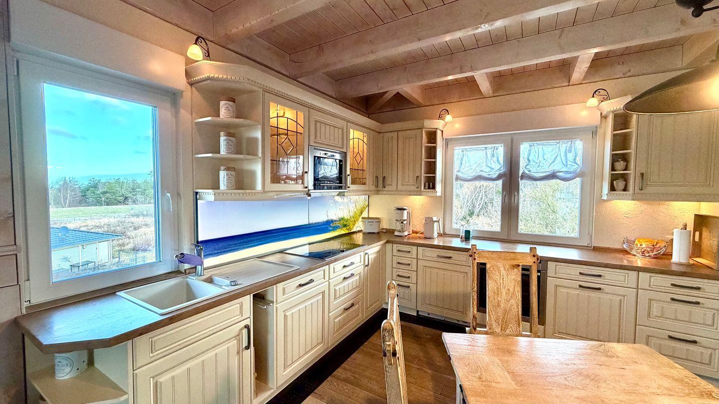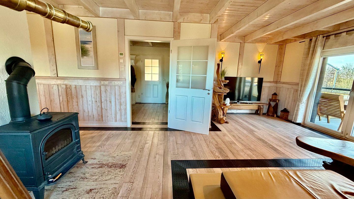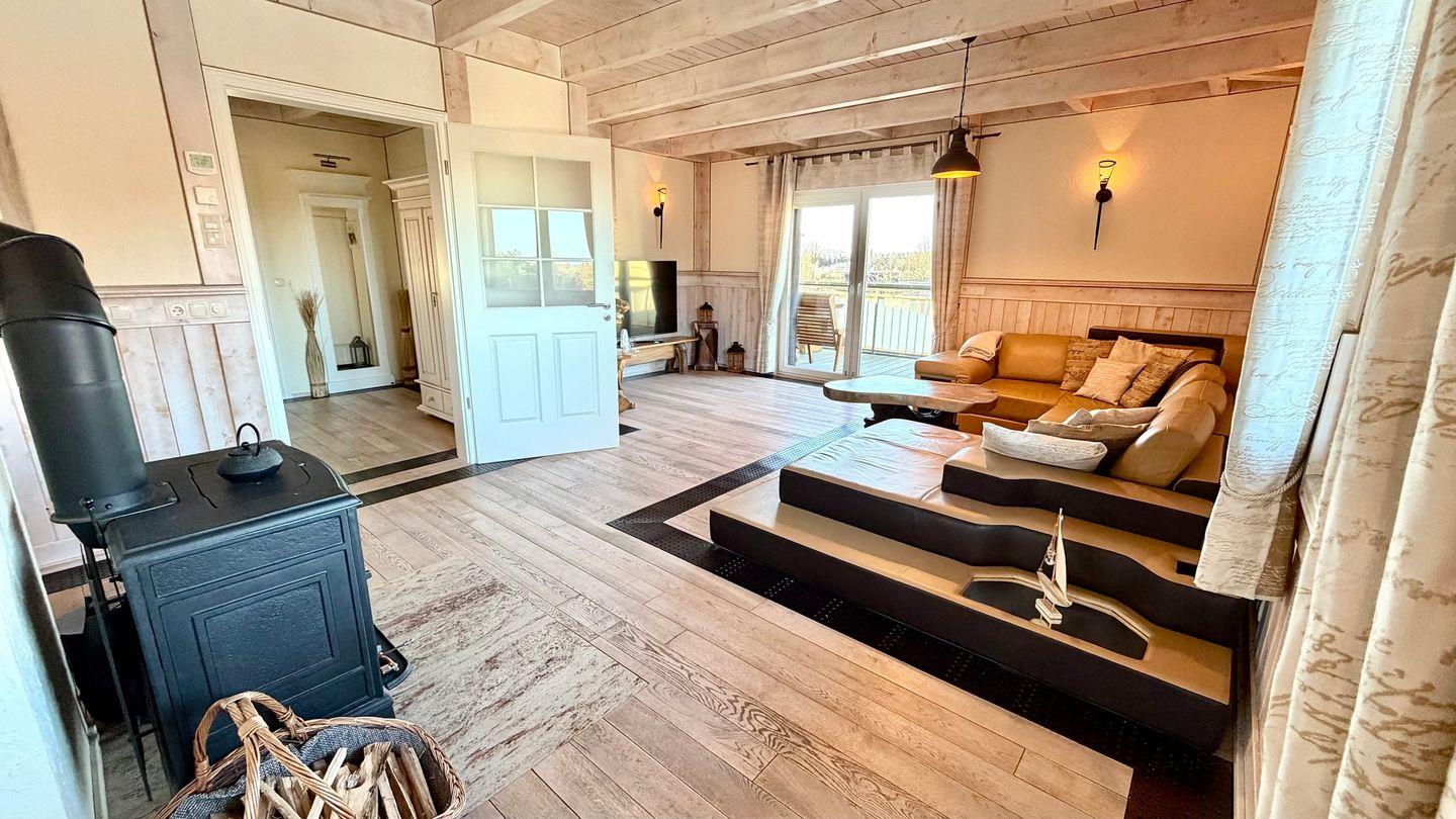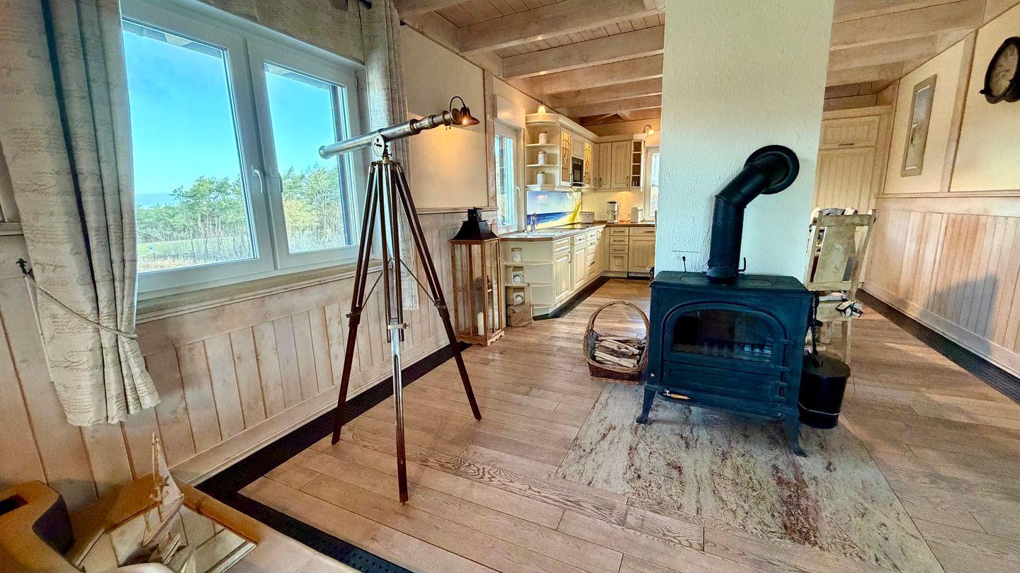 Der gemütliche Wohnbereich mit Smart-TV, Sofa und Kamin bietet einen perfekten Rückzugsort nach einem Tag am Meer. Die voll ausgestattete Küche mit Kaffeemaschine, Mikrowelle, Geschirrspüler und weiteren Annehmlichkeiten lässt keine Wünsche offen.