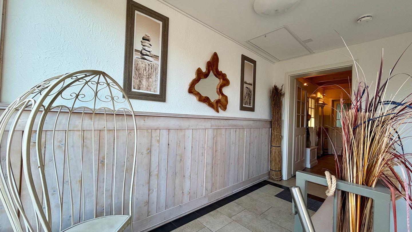 Penthouse „Meeresrauschen“: 108 m² im 2. Stock mit 3 Zimmern, 2 Schlafzimmern, für bis zu 4 Personen. Allergikergeeignetes Nichtraucher-Domizil mit Balkon, Kaminofen, 3x TV (Sat), Waschmaschine und offener Küche. Bad mit bodengleicher Dusche und Wanne. Wellness mit Sauna zur Eigennutzung und Whirlpool, 1 kostenloser Privatparkplatz. Strand und Meer nur 150 m.