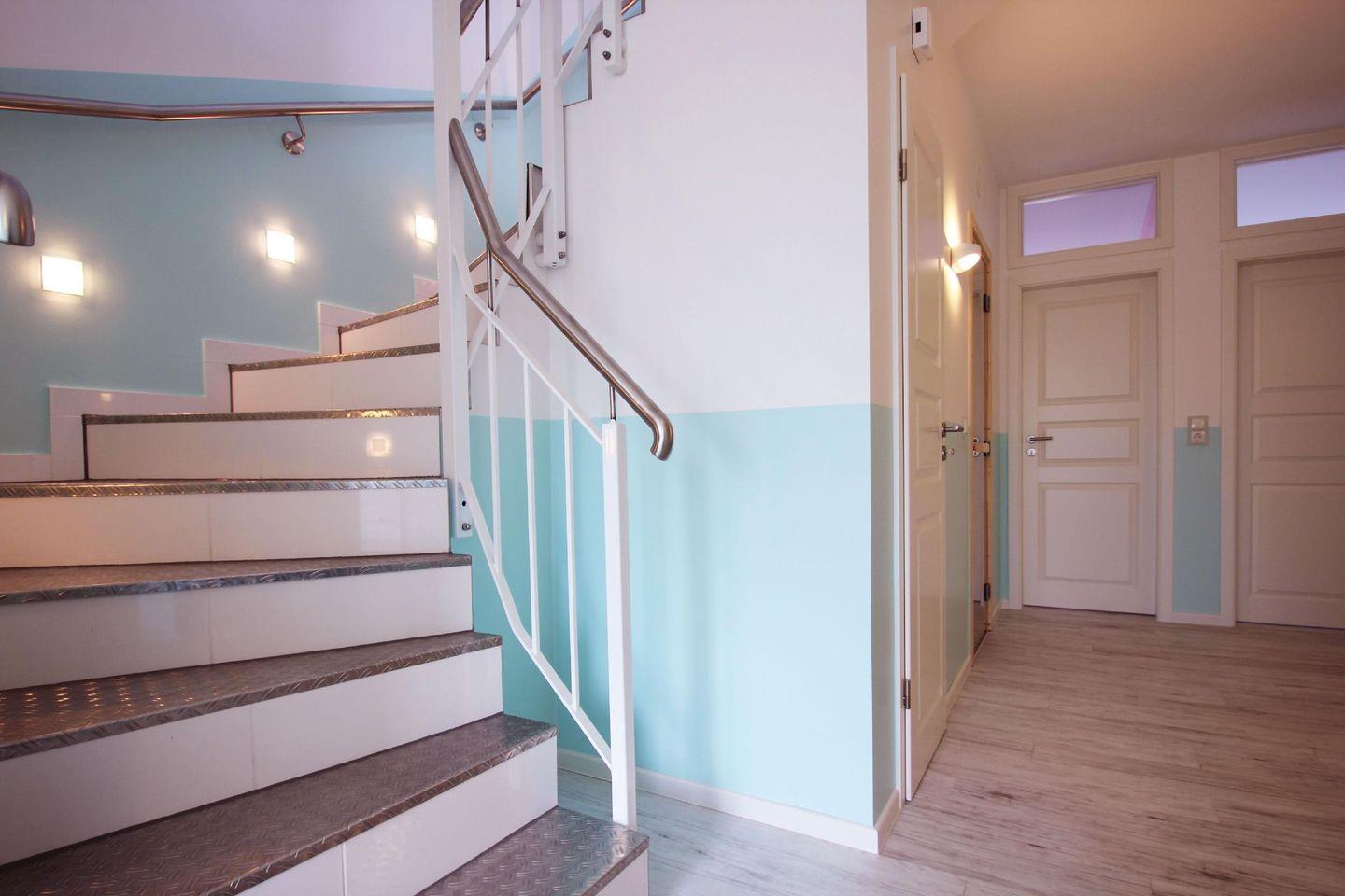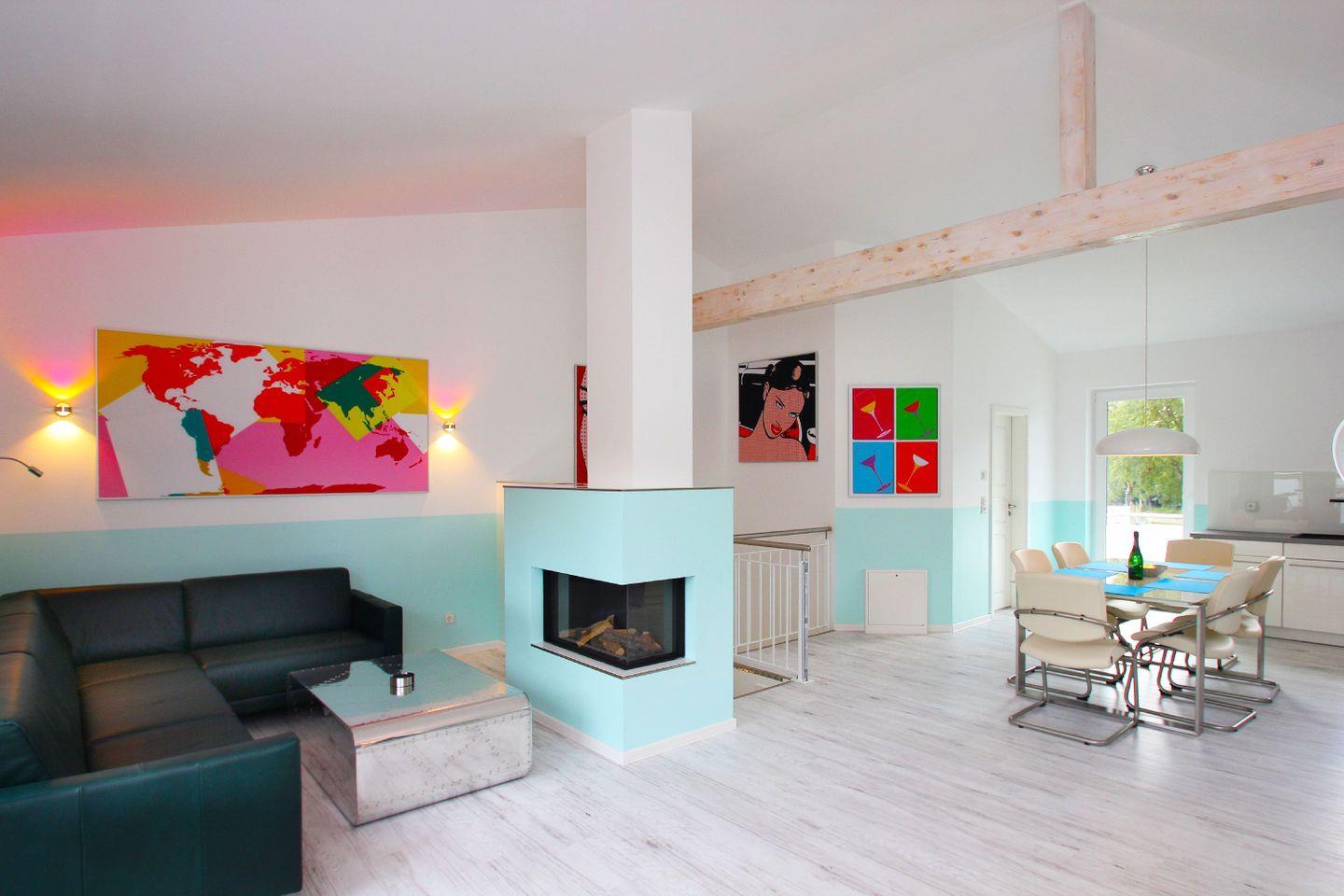 Im Obergeschoss angekommen, erwartet Sie ein großer Wohnraum mit Kamin, Ambientebeleuchtung, gemütlicher Couchecke, Flachbild-TV (55 Zoll), Kino-Soundsystem und kostenloses WLAN. Wie auch im Erdgeschoss ist hier alles mit hochwertigen HÜLSTA Möbeln eingerichtet. Die offene Küche ist mit allem ausgestattet, um auch aufwendige Gerichte zu zaubern. Neben allen erdenklichen Küchenutensilien besitzt die Küche einen großen Kühlschrank, einen separaten Eisschrank, eine Geschirrspülmaschine, einen Backofen, ein Induktionskochfeld (4 Felder) sowie eine Mikrowelle. Der große Esstisch für 6 Personen steht nicht nur zum Speisen, sondern auch für lustige Spieleabende (Spiele sind vorhanden) zur Verfügung. Weiterhin befinden sich im Obergeschoss das zweite Badezimmer, ebenfalls mit bodengleicher Wasser - Luft Regendusche. An den Wohnraum schließt sich, nur durch eine Schiebe-Fensterfront getrennt, die große Dachterrasse mit kompletter Außenmöblierung an. Das Gartengrundstück ist rundum eingezäunt.