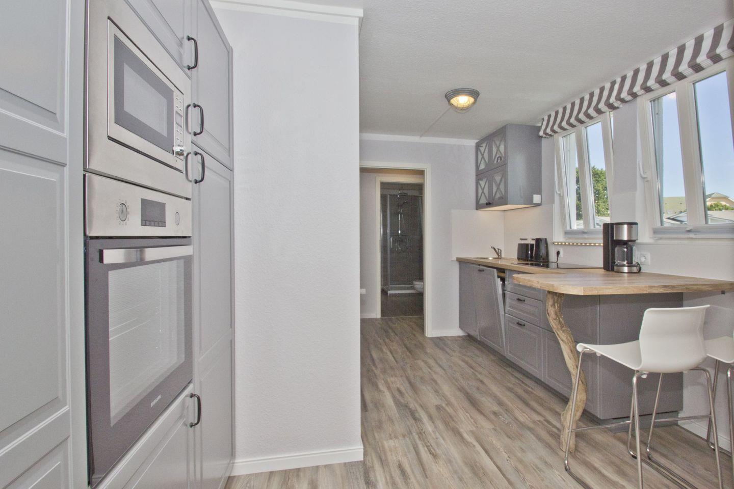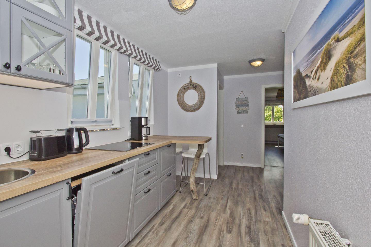 KÜCHE // separate Küche, Induktionsherd (4 Felder), Spülmaschine, Kühlschrank mit Gefrierfach, Backofen, Mikrowelle, Toaster, Wasserkocher, Kaffeemaschine, reichlich Besteck, Geschirr und Küchenutensilien ++