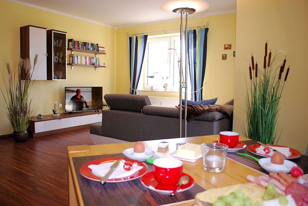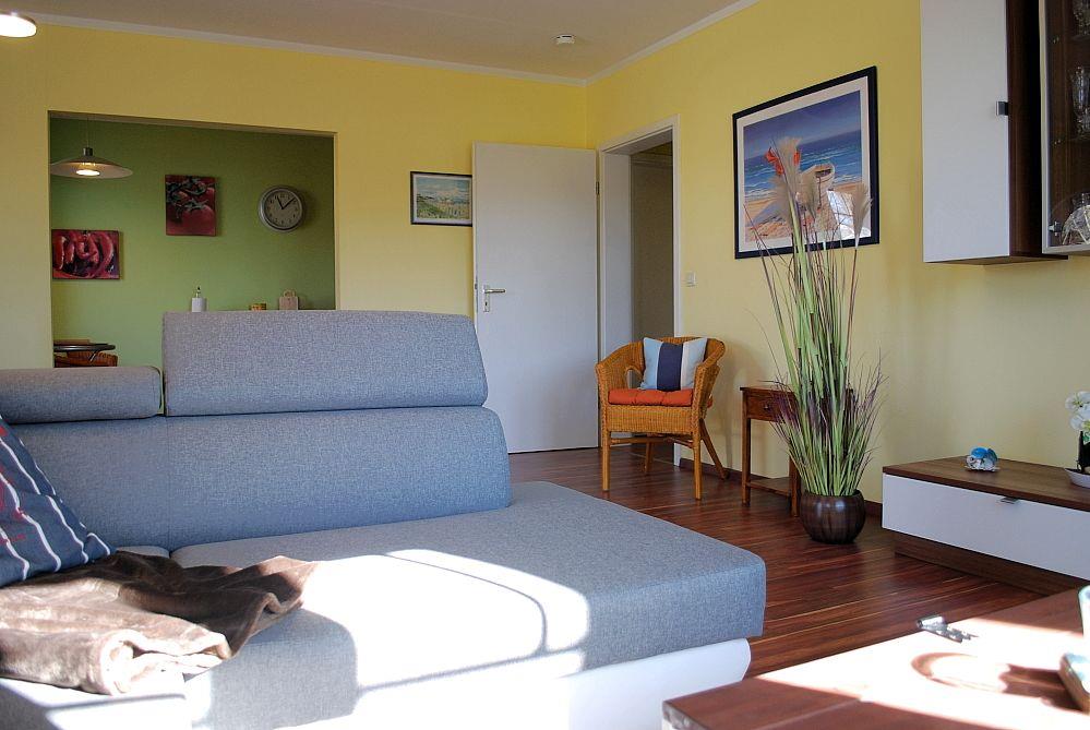 Geräumige, helle 2-Zimmer-Wohnung mit Süd-West-Balkon und moderner und gehobener Ausstattung. Die 61 m² große Wohnung befindet sich im EG und verfügt über ein großzügiges separates Schlafzimmer (Doppelbett), ein großes Wohnzimmer mit Essplatz, eine voll ausgestattete Küche mit Sitzecke, kostenfreies Wlan und ein Duschbad. Ein PKW-Garagenstellplatz gehört ebenfalls zur Wohnung.