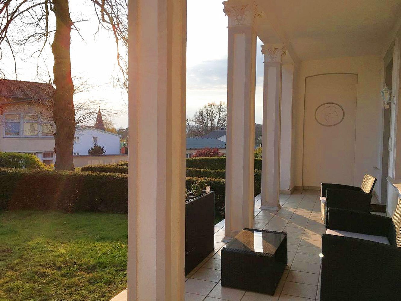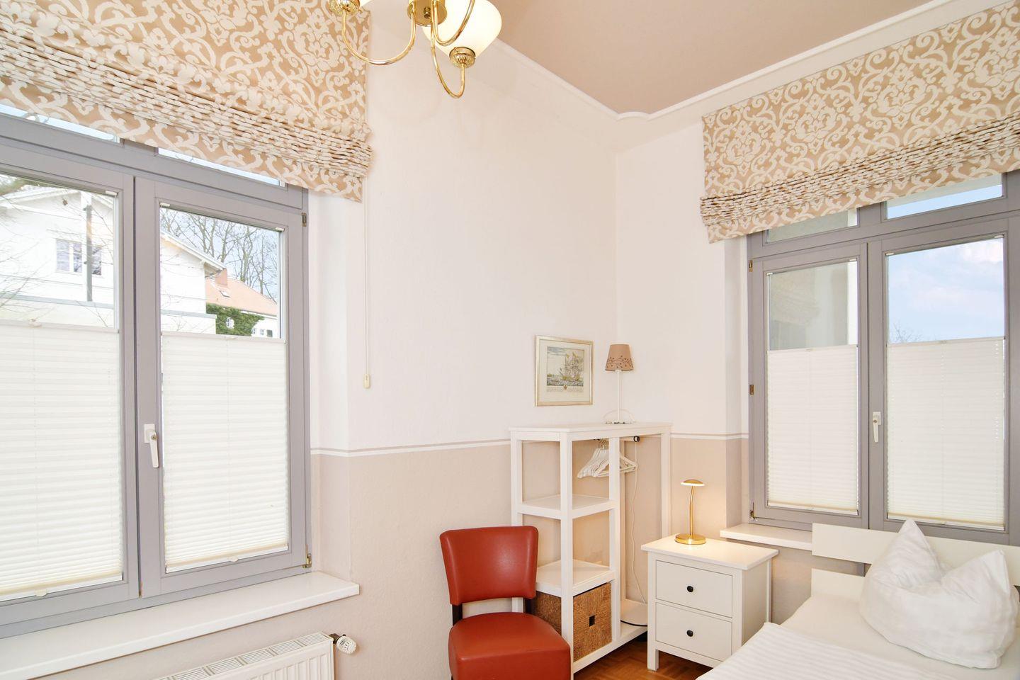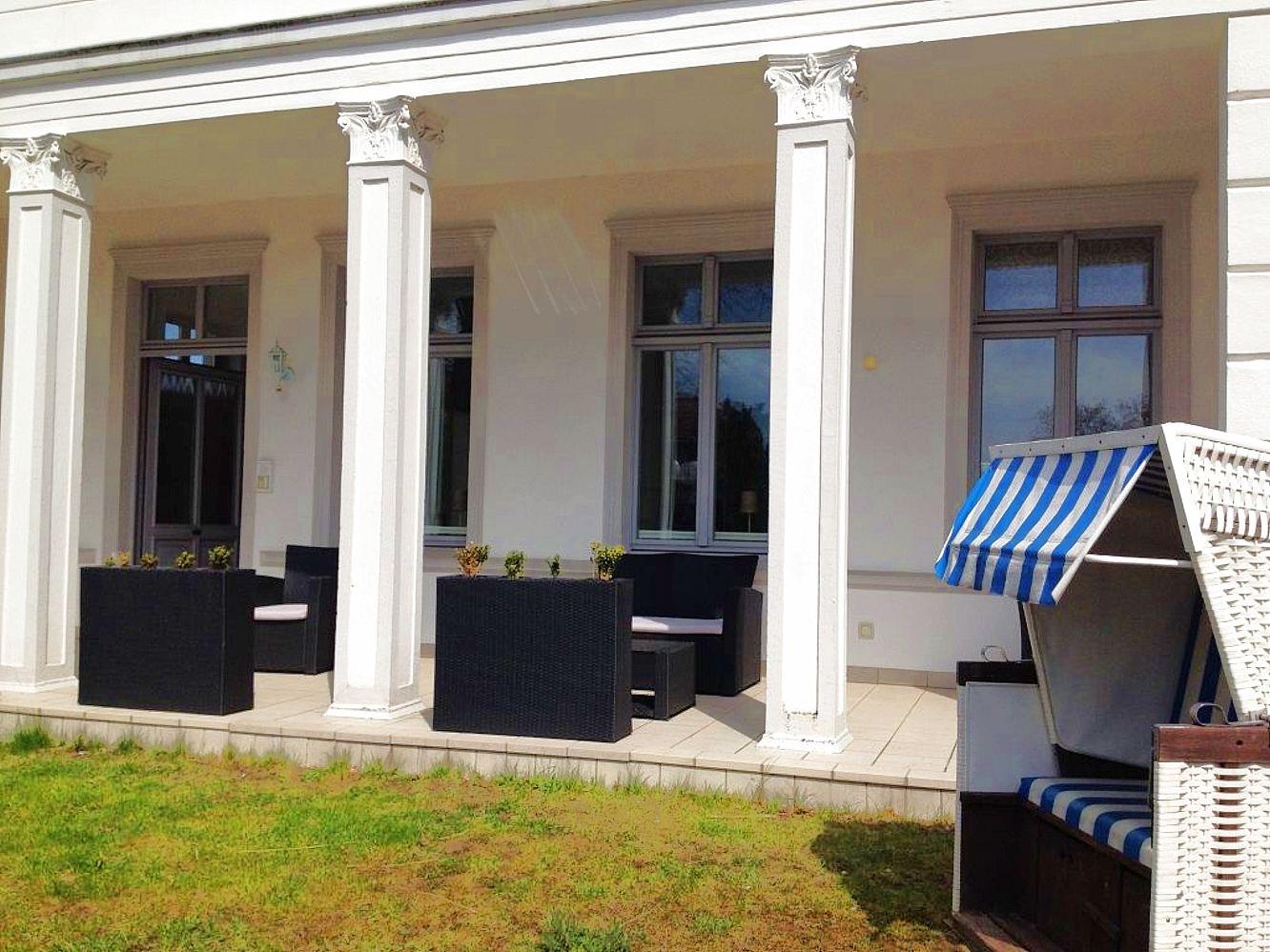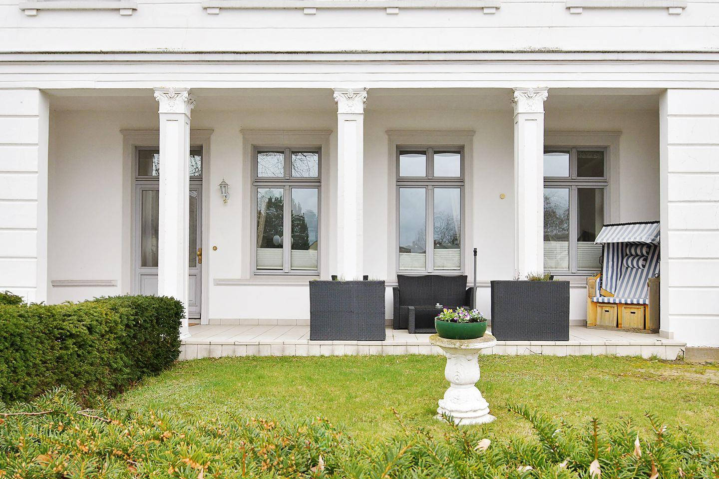 Die Villa Schering wurde nach der Wiedervereinigung im Stil der Bäderarchitektur renoviert und liegt zusammen mit dem Haus am Kliff in erster Reihe direkt an der Steilküste zur Ostsee auf der alten Düne dem "Kulm". Das 70 m² große Appartement befindet sich im Ergeschoss der Villa und verfügt neben einer sehr großen Süd-Terrasse und eigenen Gartenbereich mit Strandkorb über ein großzügiges Wohnzimmer mit voll ausgestatteter Küchenzeile und Essplatz, ein Duschbad und zwei Schlafzimmer (Doppelbett und zwei Einzelbetten). Es stehen ein PKW-Stellplatz und kostenfreies WLAN zur Verfügung. Haustiere sind auf Anfrage gestattet.