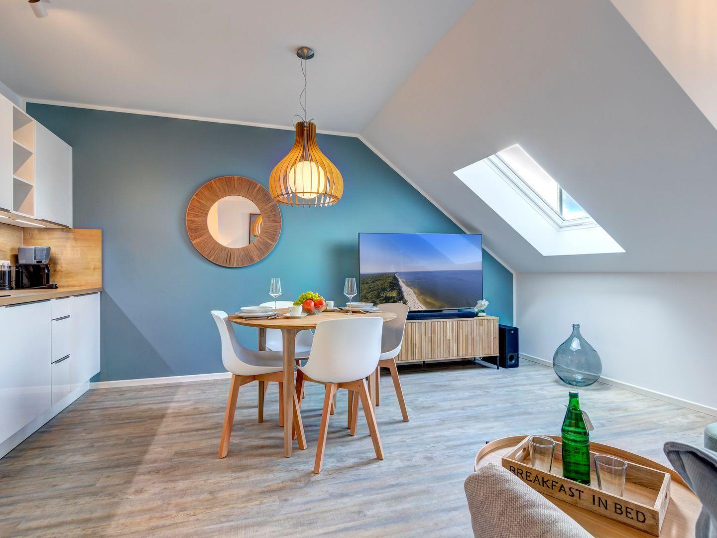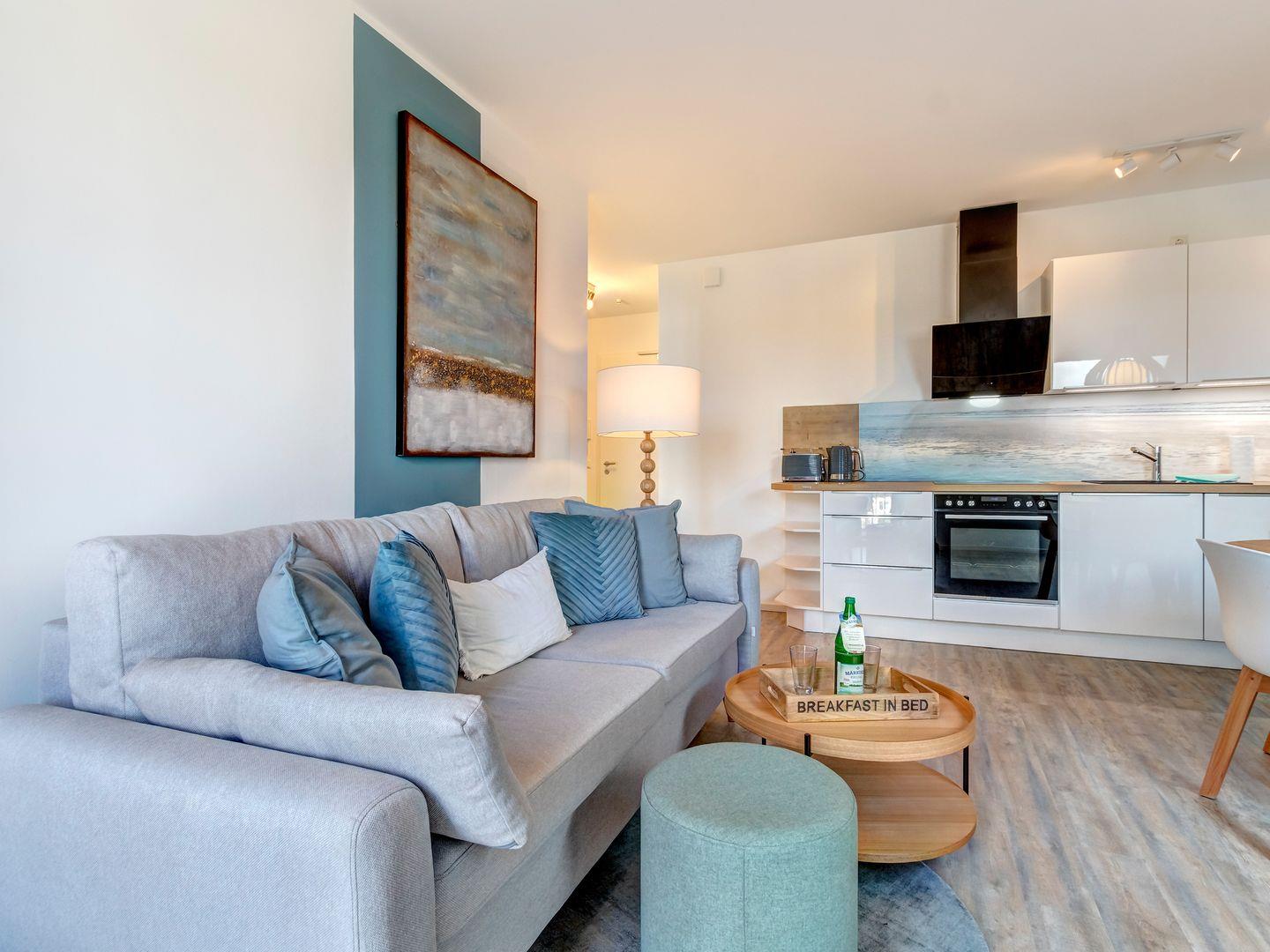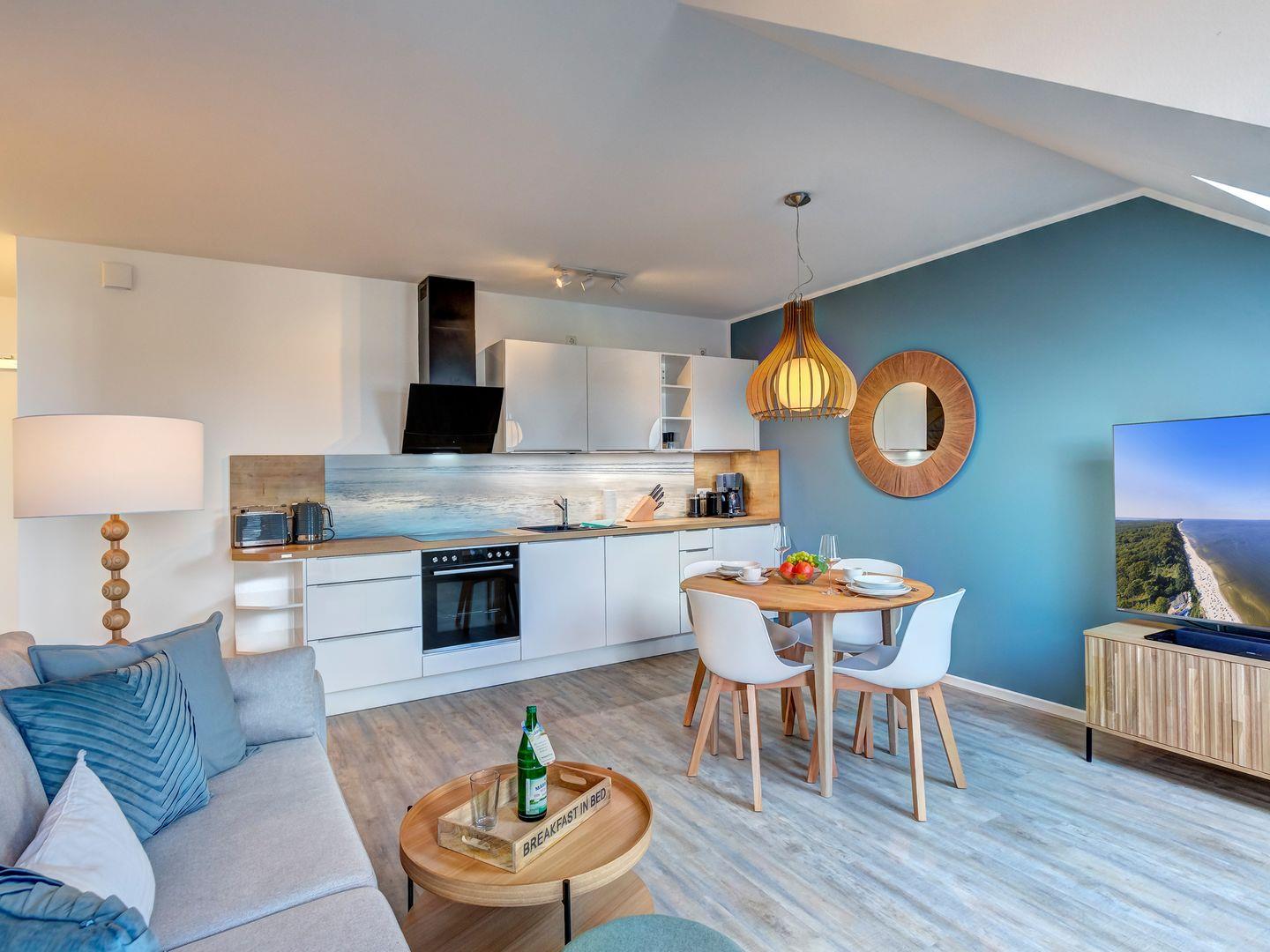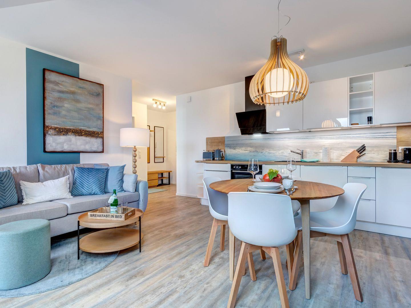 Die Wohnung beeindruckt durch ihre ruhige Lage und den atemberaubenden Blick über den Kölpinsee, der sich vom eigenen, geräumigen Balkon mit Terrasse aus bestaunen lässt. Im gemütlichen Wohnbereich erwartet Sie eine voll ausgestattete Küche und ein modernes Schlafsofa – perfekt für gesellige Abende oder entspannte Stunden.