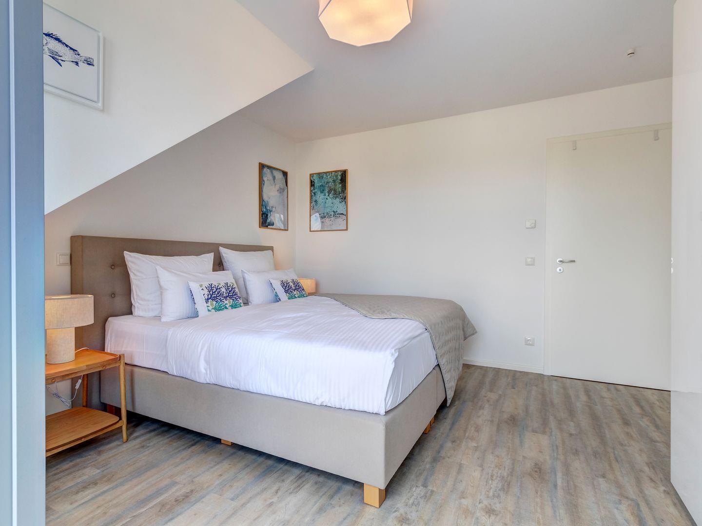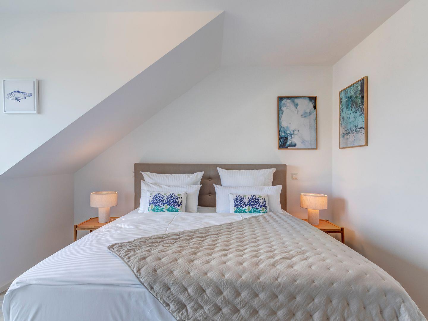 Das Schlafzimmer lockt mit einem komfortablen Boxspringbett für erholsame Nächte zu zweit. Das Badezimmer ist modern gestaltet, mit einer geräumigen Dusche.