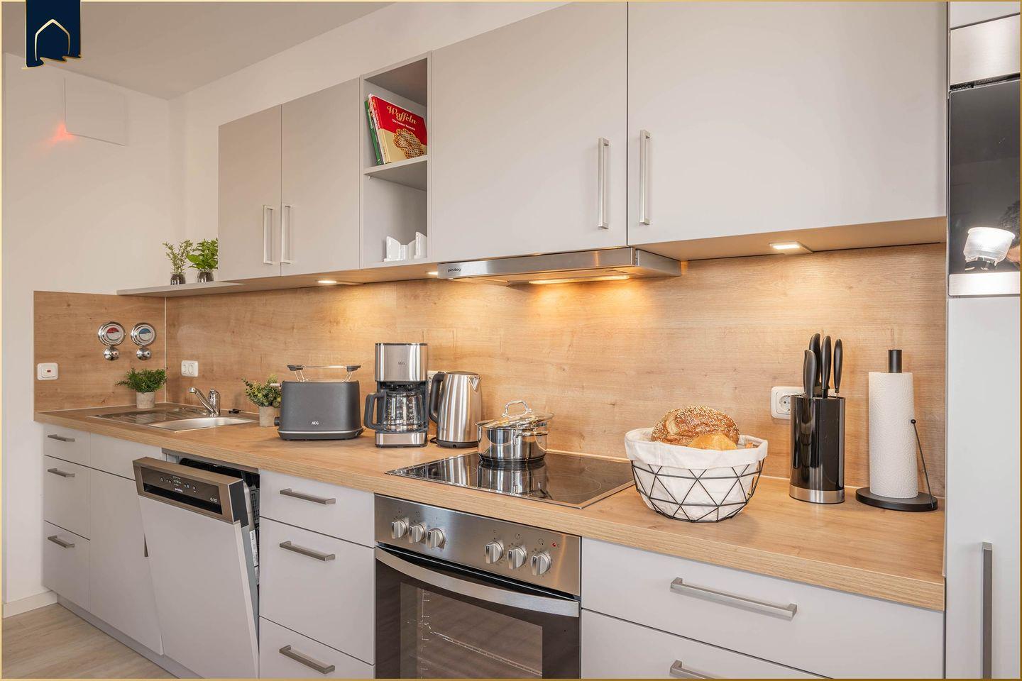 Das Herzstück der Ferienwohnung ist der offen gestaltete Wohnbereich mit gemütlicher Sofaecke, TV und Essplatz. Von hier aus gelangen Sie direkt auf den möblierten Balkon – ideal für entspannte Abende an der frischen Seeluft. Die voll ausgestattete Küche lässt keine Wünsche offen: Geschirrspüler, Backofen, Mikrowelle, Kühlschrank mit Gefrierfach, Kaffeemaschine, Küchenutensilien und sogar eine Küchenmaschine stehen zur Verfügung.