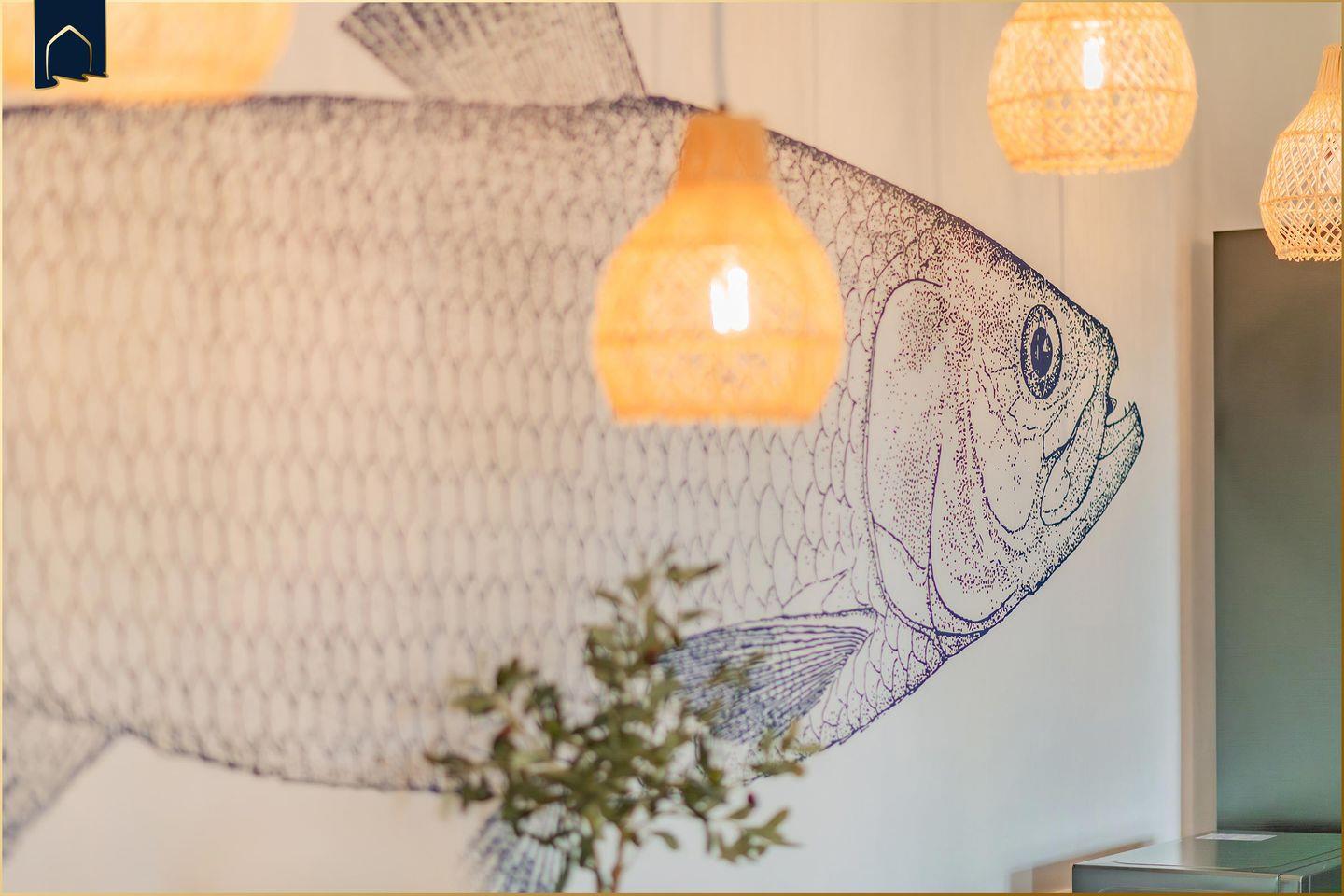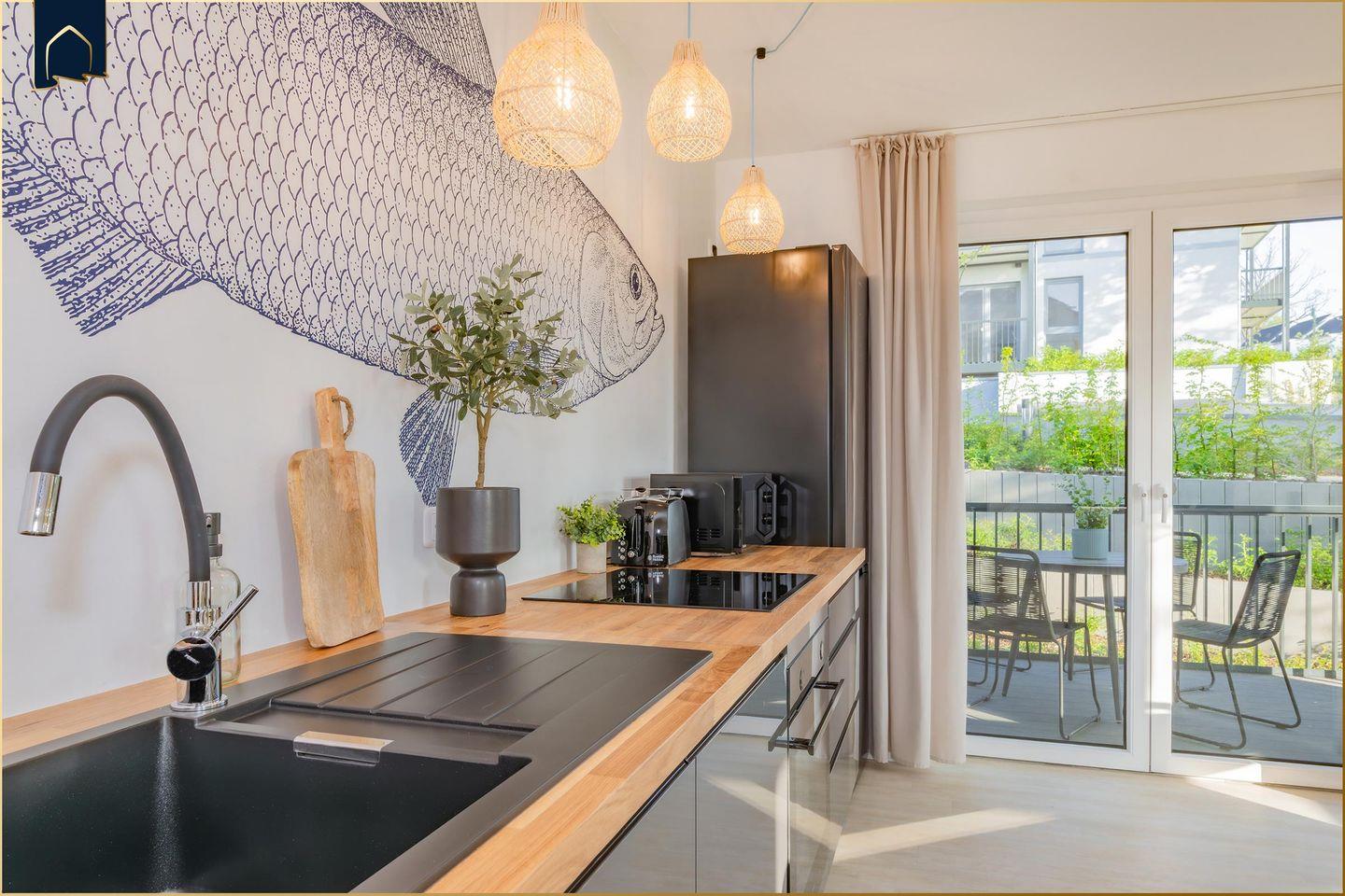 In der voll ausgestatteten Küche bleiben keine Wünsche offen: Induktionsherd, Mikrowelle, Backofen, Spülmaschine, Kaffeemaschine, Espressomaschine, Toaster, Mixer, Kühlschrank mit Gefrierfach … alles da! Dank durchdachtem Design ohne Hängeschränke ist alles leicht zugänglich – perfekt für kleine oder große Helfer am Tisch.