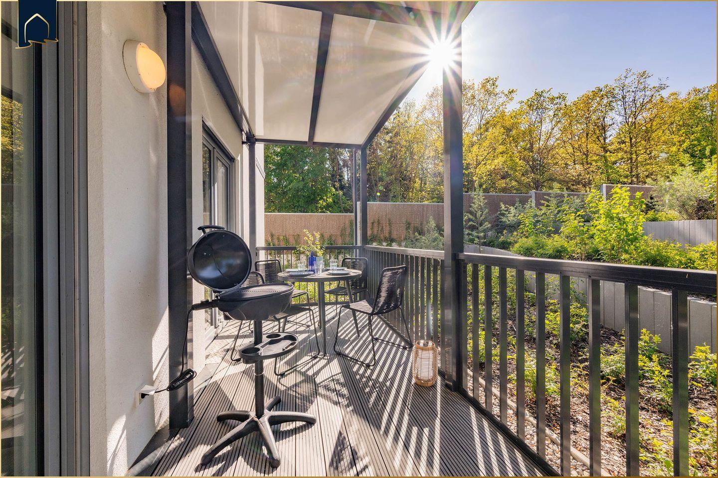 Grill an, Füße hoch und ins Grüne schauen – so fühlt sich Urlaub an. Die überdachte Terrasse ist mit bequemen Gartenmöbeln und einem Elektrogrill ausgestattet – hier lässt sich der Tag wunderbar ausklingen.