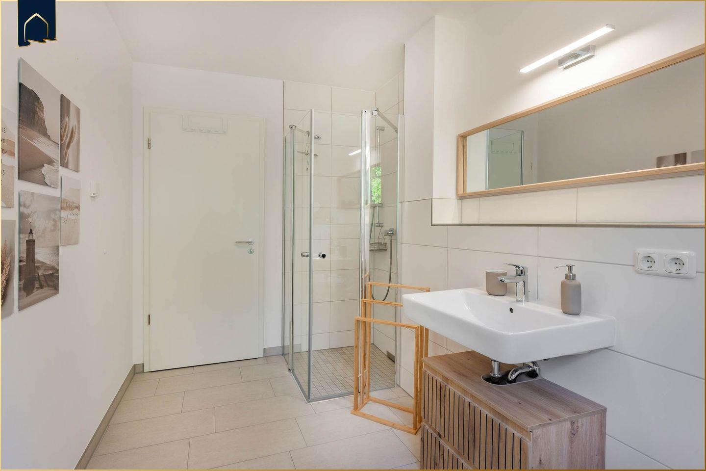 Die offene, voll ausgestattete Küche lässt keine Wünsche offen: Ein Herd mit Backofen, Mikrowelle, Kühlschrank mit Gefrierfach, Spülmaschine, Kaffeemaschine, Toaster, Wasserkocher und reichlich Küchenutensilien stehen zur Verfügung. Auch ein Gäste-WC ergänzt das moderne Badezimmer mit Dusche, Waschbecken und Haartrockner – ideal bei Belegung mit mehreren Personen. Brettspiele und Bücher sorgen für Unterhaltung an Regentagen, während drei Fernseher in der Wohnung individuelle Rückzugsmöglichkeiten bieten. Ein Ganzkörperspiegel, Kosmetikspiegel, Garderobe und weitere durchdachte Details machen den Aufenthalt besonders angenehm.