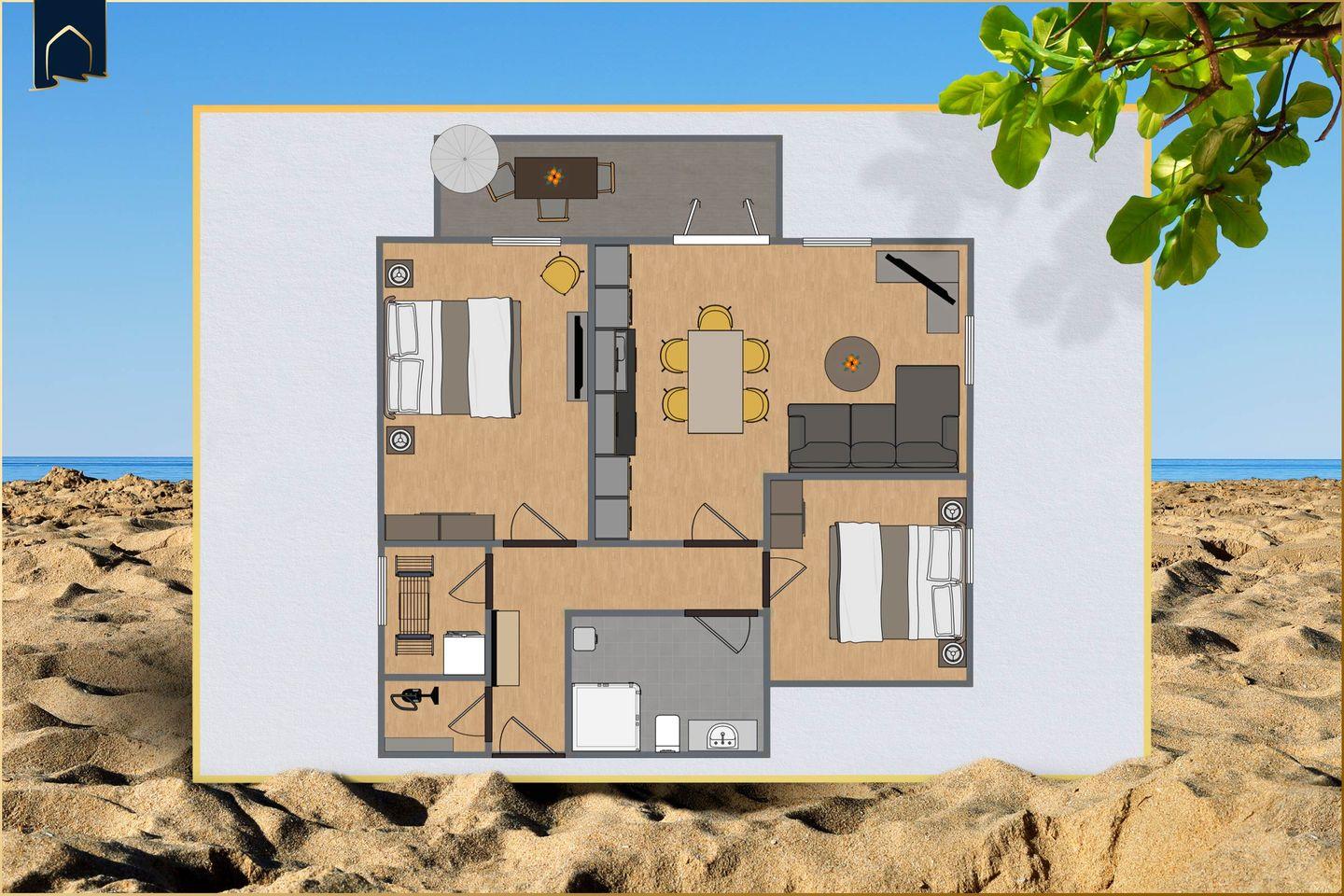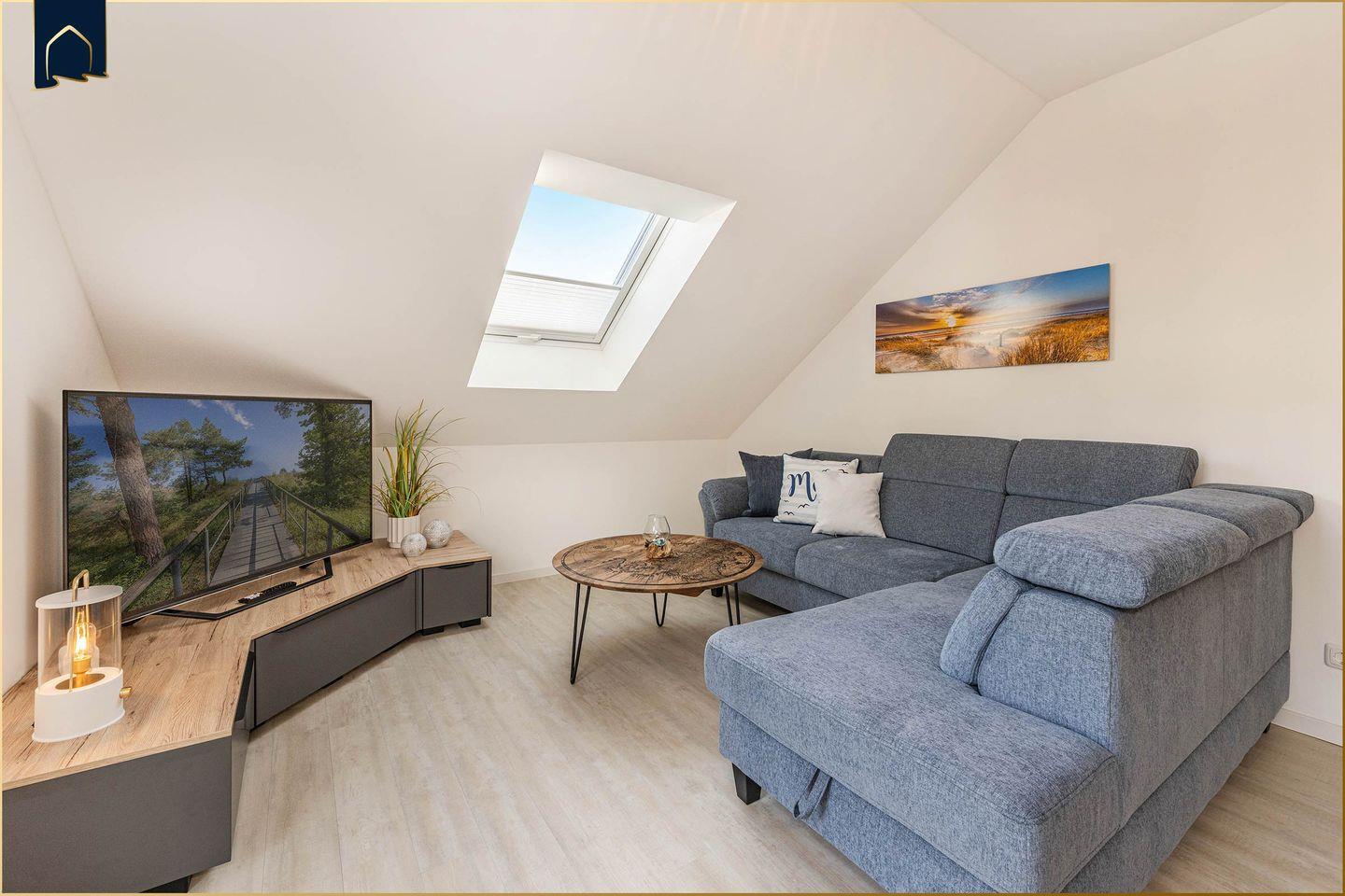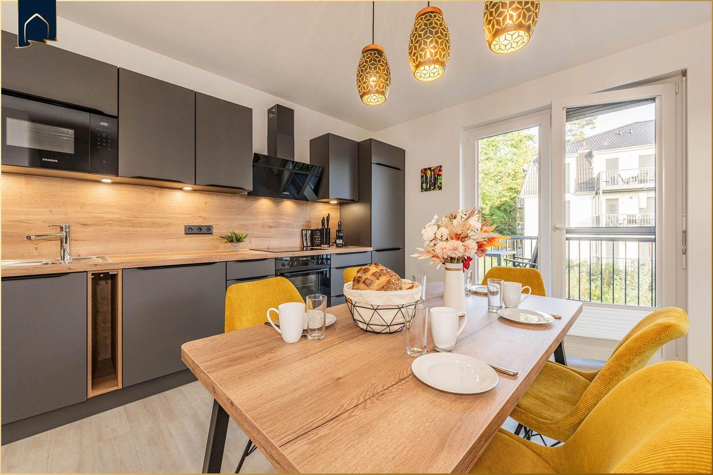 Die offene Wohnküche ist mit allem ausgestattet, was das Herz begehrt: Ceranherd, Backofen, Mikrowelle, Spülmaschine, Kühlschrank mit Gefrierfach, Kaffeemaschine, Espressomaschine, Toaster und Wasserkocher. Für Unterhaltung sorgen zwei große Flachbild-TVs mit Kabelanschluss und WLAN in der gesamten Wohnung. Die moderne Einrichtung mit gemütlicher Sofaecke, Garderobe und Essbereich schafft eine wohnliche Atmosphäre – auch bei längerem Aufenthalt.