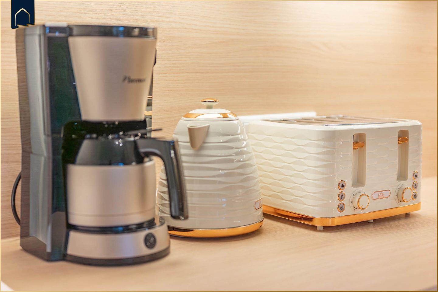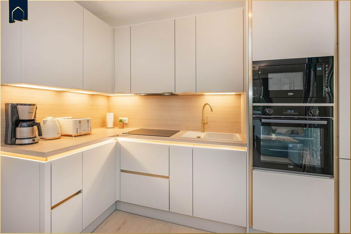 Die offen integrierte Küche ist funktional und komfortabel ausgestattet. Ein Induktionskochfeld, Backofen, Mikrowelle, Geschirrspüler, Kaffeemaschine und Wasserkocher ermöglichen eine flexible Selbstversorgung. Der angrenzende Essbereich lädt zu gemeinsamen Mahlzeiten ein und greift das stilvolle Wohnkonzept mit dezenten goldfarbenen Details harmonisch auf.