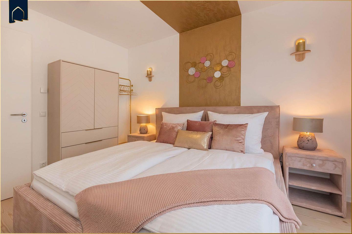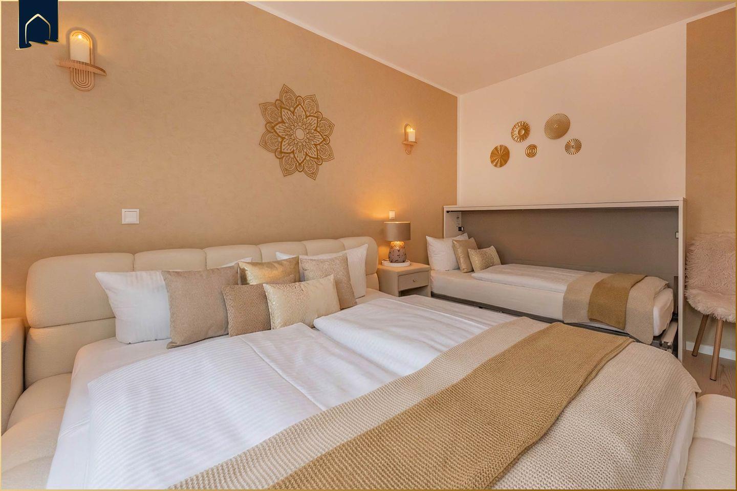 Die Ferienwohnung verfügt über zwei separate Schlafzimmer, die ruhig gelegen sind und erholsamen Schlaf bieten. Hochwertige Betten, abgestimmte Farben und dekorative Elemente sorgen für eine angenehme Atmosphäre. Zusätzliche Schlafmöglichkeiten machen die Wohnung auch für mehrere Personen gut nutzbar. Insgesamt stehen bis zu 7 Schlafmöglichkeiten zur Verfügung.