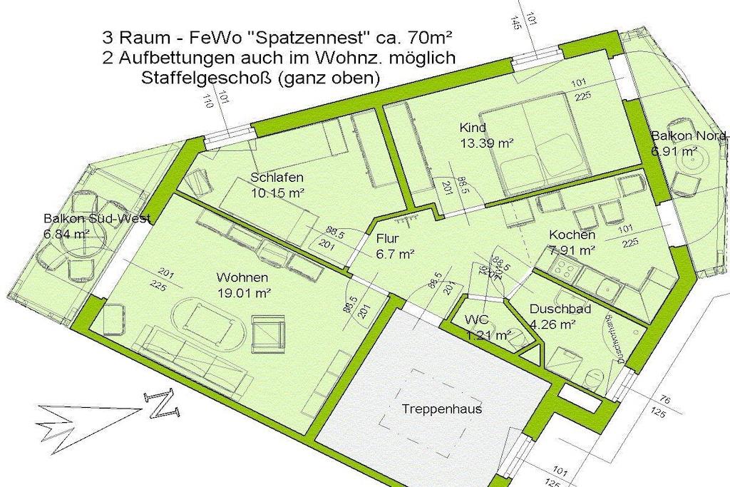Unsere schöne 3-Raum Ferienwohnung "Spatzennest" befindet sich in der obersten Etage des Hauses, wo Sie vom Balkon aus die Aussicht genießen können. Durch die sehr gute Lage in Kühlungsborn-West finden Sie in unmittelbarer Umgebung alles, was Sie für einen schönen Urlaub benötigen: den langen Sandstrand, die Promenade, viele Restaurants und Bars, den Konzertgarten, den Stadtwald und noch viele weitere Orte für diverse Unternehmungen. So können Sie Ihr Auto auch mal ein paar Tage stehen lassen. Die Unterkunft Die Wohnung ist mit einem Schlafzimmer mit Doppelbett (180x200) und einem zweiten Schlafzimmer mit 2 Einzelbetten (80x200) ideal für Familien mit 2 Kindern. Eine Aufbettung auf dem Schlafsofa ist zusätzlich möglich. Zwei Balkone ausgerichtet zur Süd-West- und Ostseite laden zum Verweilen ein. Ein voll ausgestattetes Bad mit einer fußbodengleichen Dusche und einer Waschmaschine inkl. separatem Gäste-WC bieten einen extra Komfort. In der Küche mit Zugang auf einen der Balkone befindet sich eine Sitzecke, in der man gemütlich miteinander essen kann. Auf Wunsch können Bettwäsche (20,00EURO/Gast) und Handtücher (10,00EURO/Gast) dazu gebucht werden.
