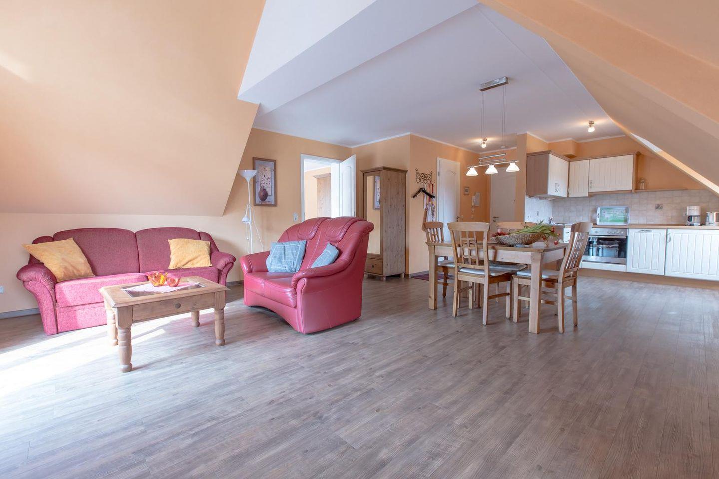Die ca. 55 qm große 2-Zimmer-Ferienwohnung befindet sich in der 3. Etage unseres Hauses.