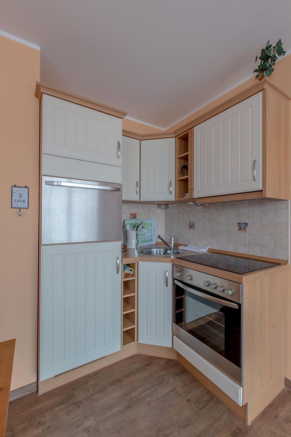 Offene Küchenzeile im Wohnraum mit Ceranfeld, Backofen, Geschirrspüler, Kühlschrank mit Gefrierfach