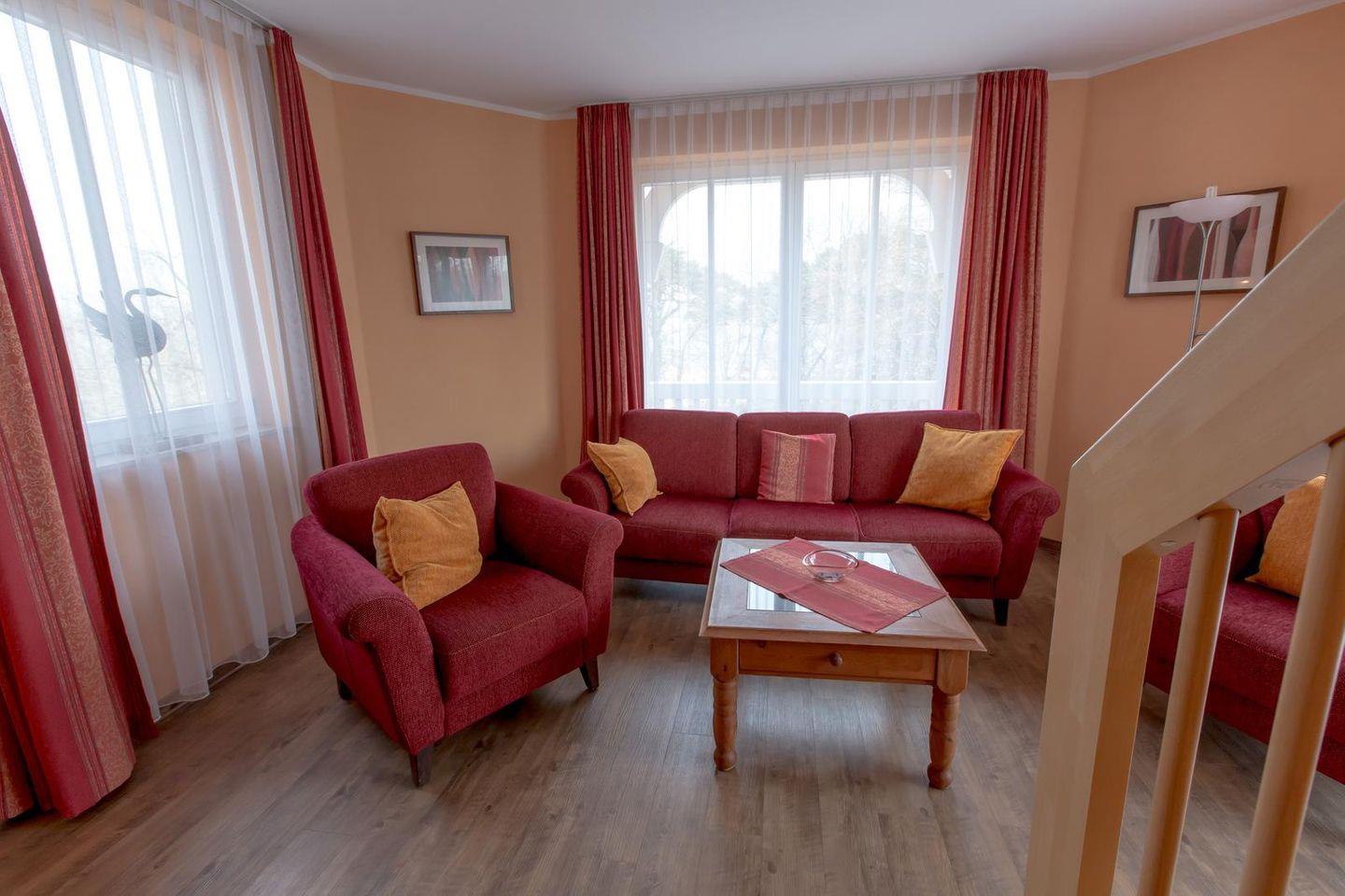Unsere beliebte Hochzeits- bzw. Turm-Suite: Die ca. 70 qm große 3-Raum-Maisonettewohnung erstreckt sich über 2 Etagen; vom Wohnzimmer erreichen Sie über eine Treppe die Empore und das 2. Schlafzimmer mit Panoramablick