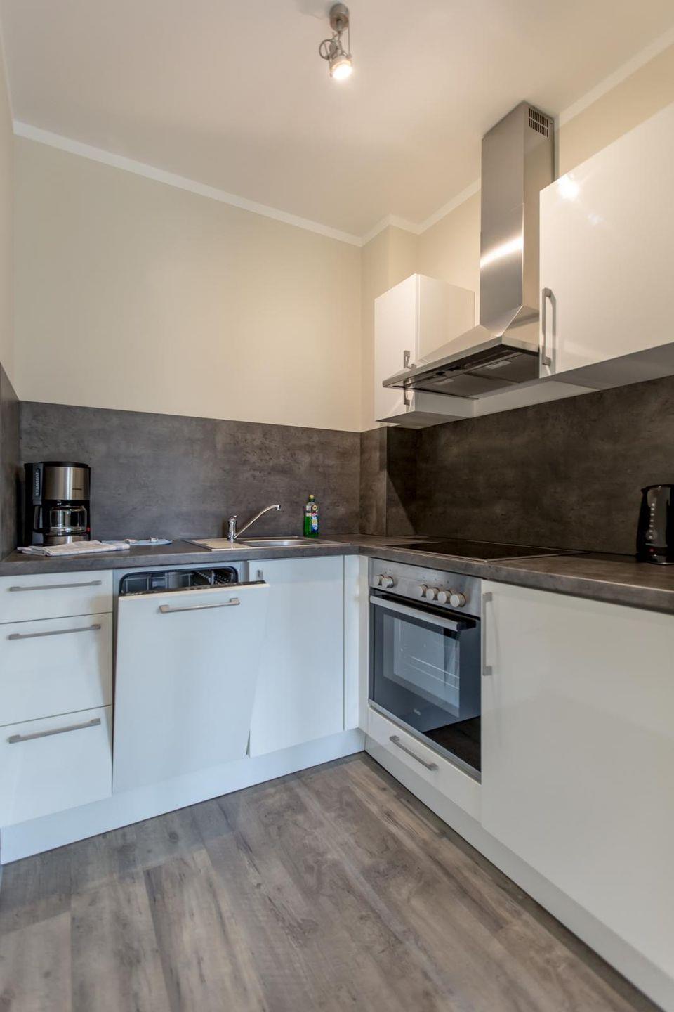 Offene Küchenzeile im Wohnraum mit Ceranfeld, Backofen, Geschirrspüler, Kühlschrank mit Gefrierfach