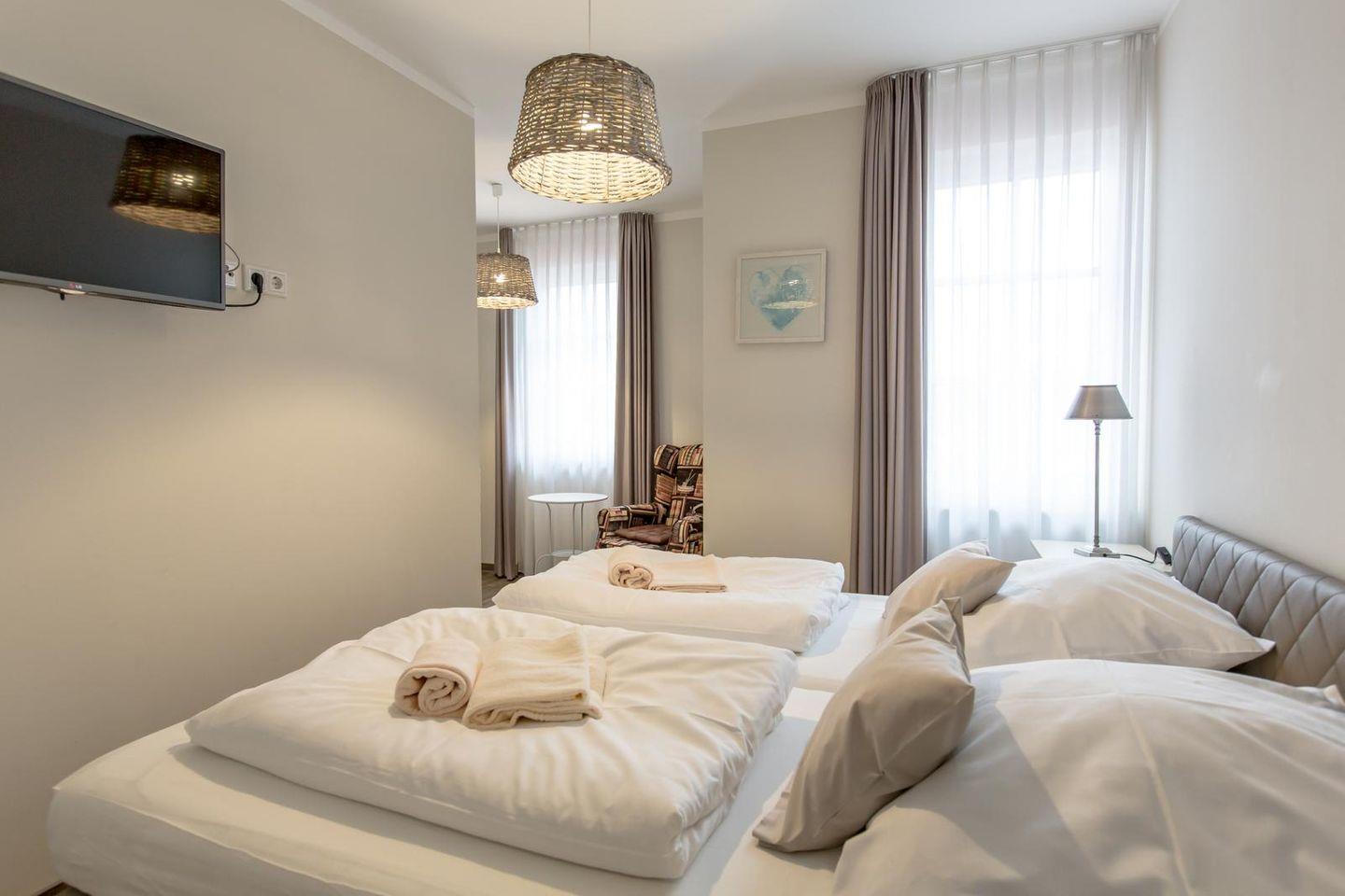 Die ca. 70 qm große 3-Zimmer-Ferienwohnung befindet sich im Dachgeschoss der Villa Borwin.