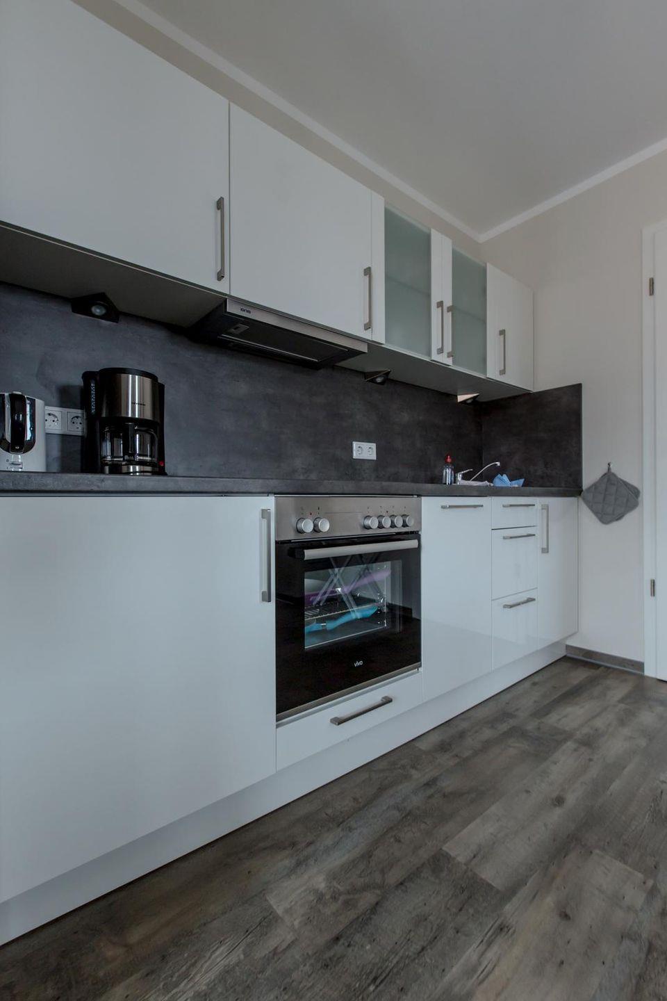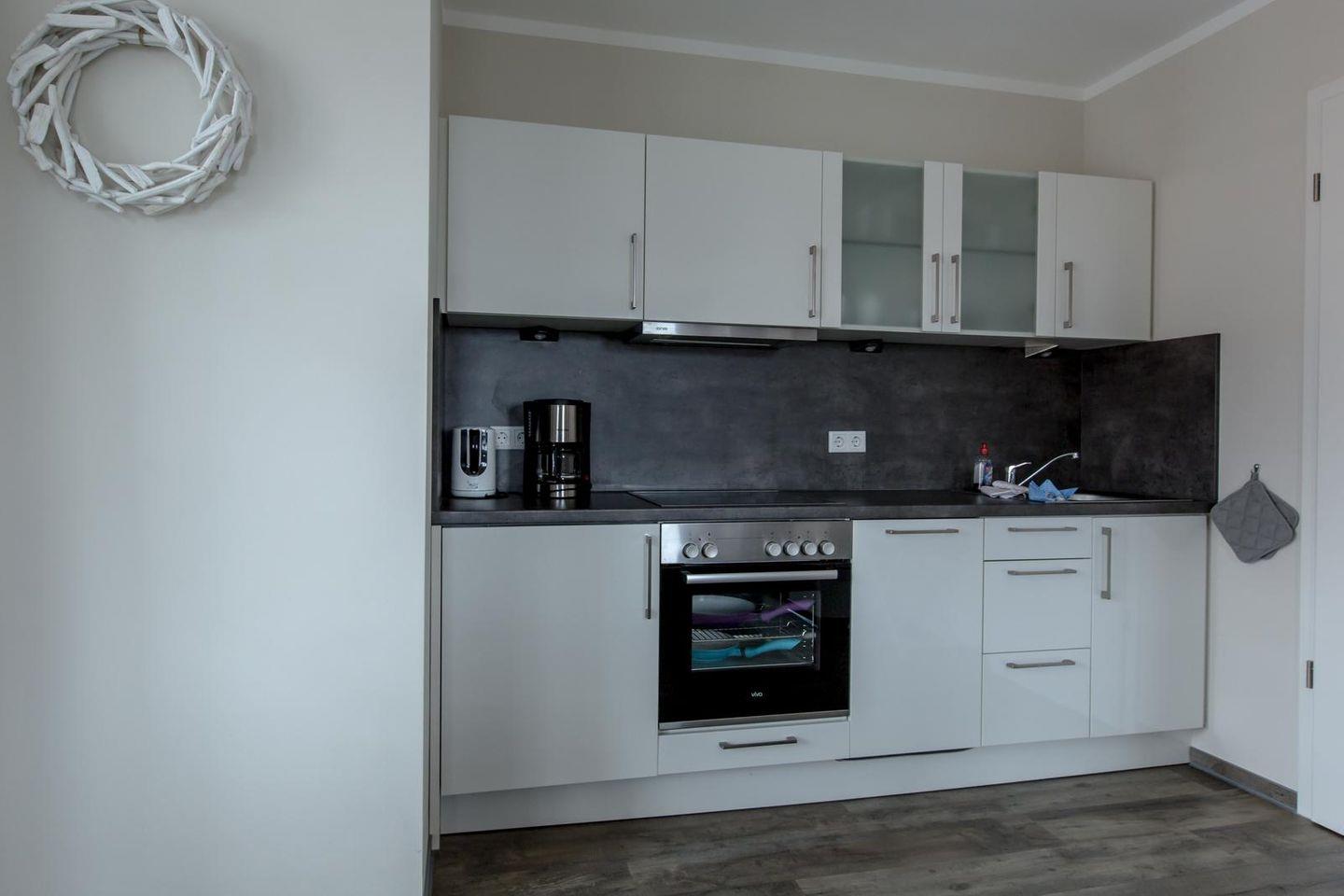 Offene Küchenzeile im Wohnraum mit Ceranfeld, Backofen, Geschirrspüler, Kühlschrank mit Gefrierfach