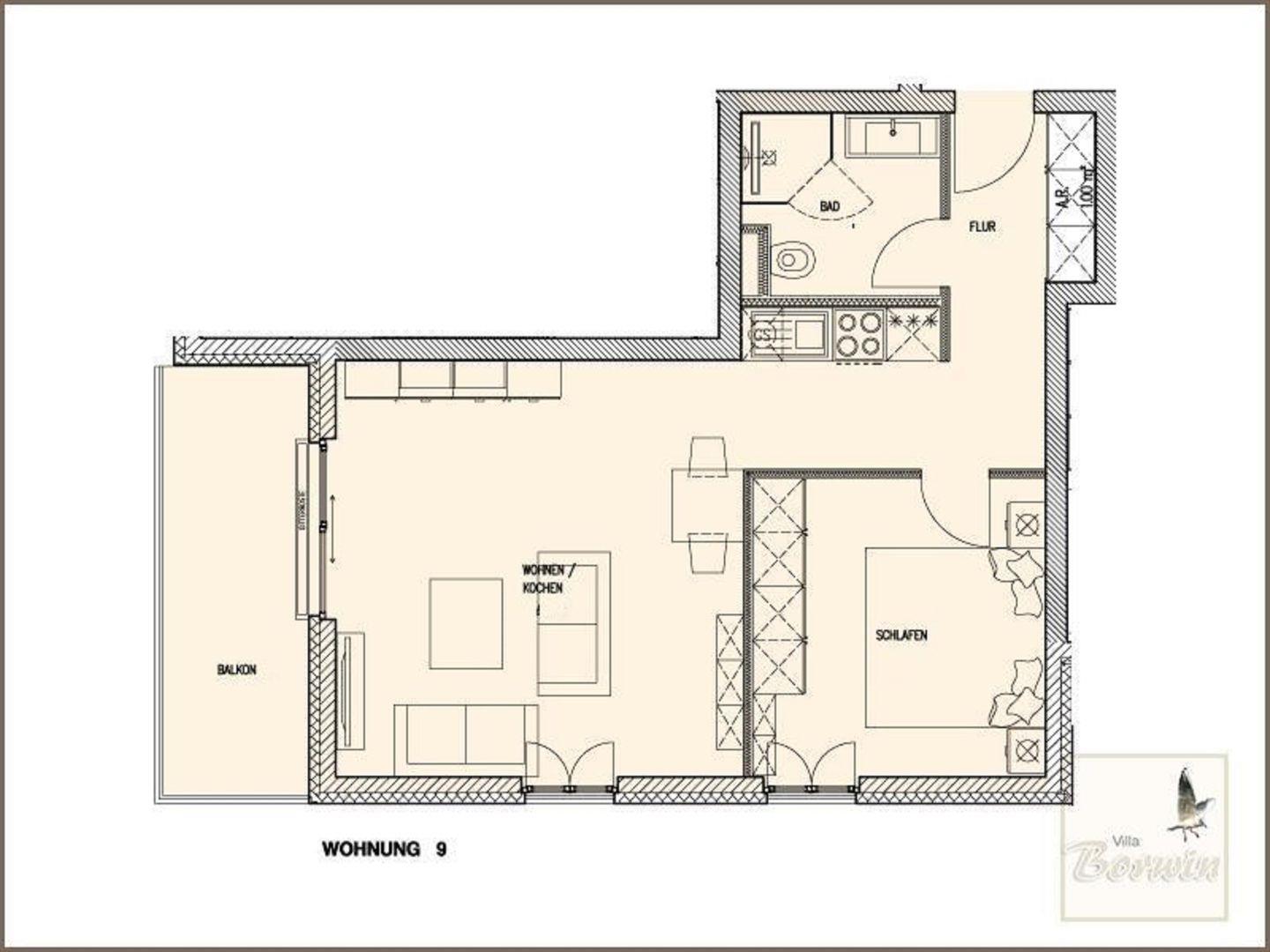 Diese ca. 50 qm große 2-Zimmer-Ferienwohnung befindet sich im 1. Obergeschoss der Villa Borwin.