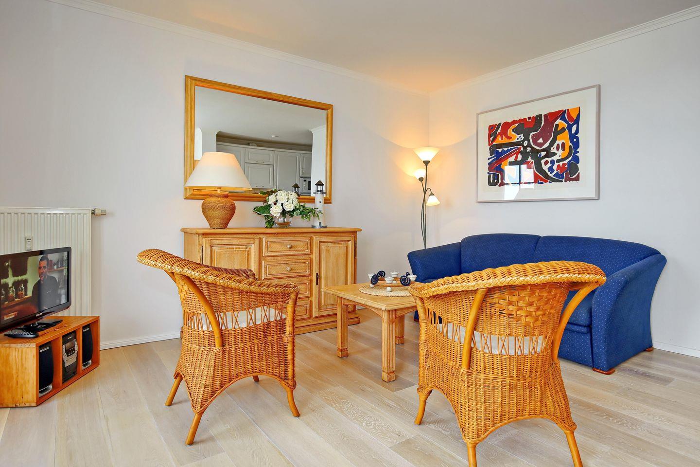 Der Wohnbereich der Ferienwohnung empfängt dich mit einer gemütlichen Couch mit 2 Korbsesseln, einem Flatscreen-TV sowie einem Blu-Ray-Player zu geselligen Abendstunden. Das WLAN nutzt du kostenfrei. Der angrenzende Essbereich bietet dir mit einem Tisch und zwei Stühlen genügend Platz für deine gemeinsamen Mahlzeiten. Von hier hast du Zugang zu dem möblierten Balkon.