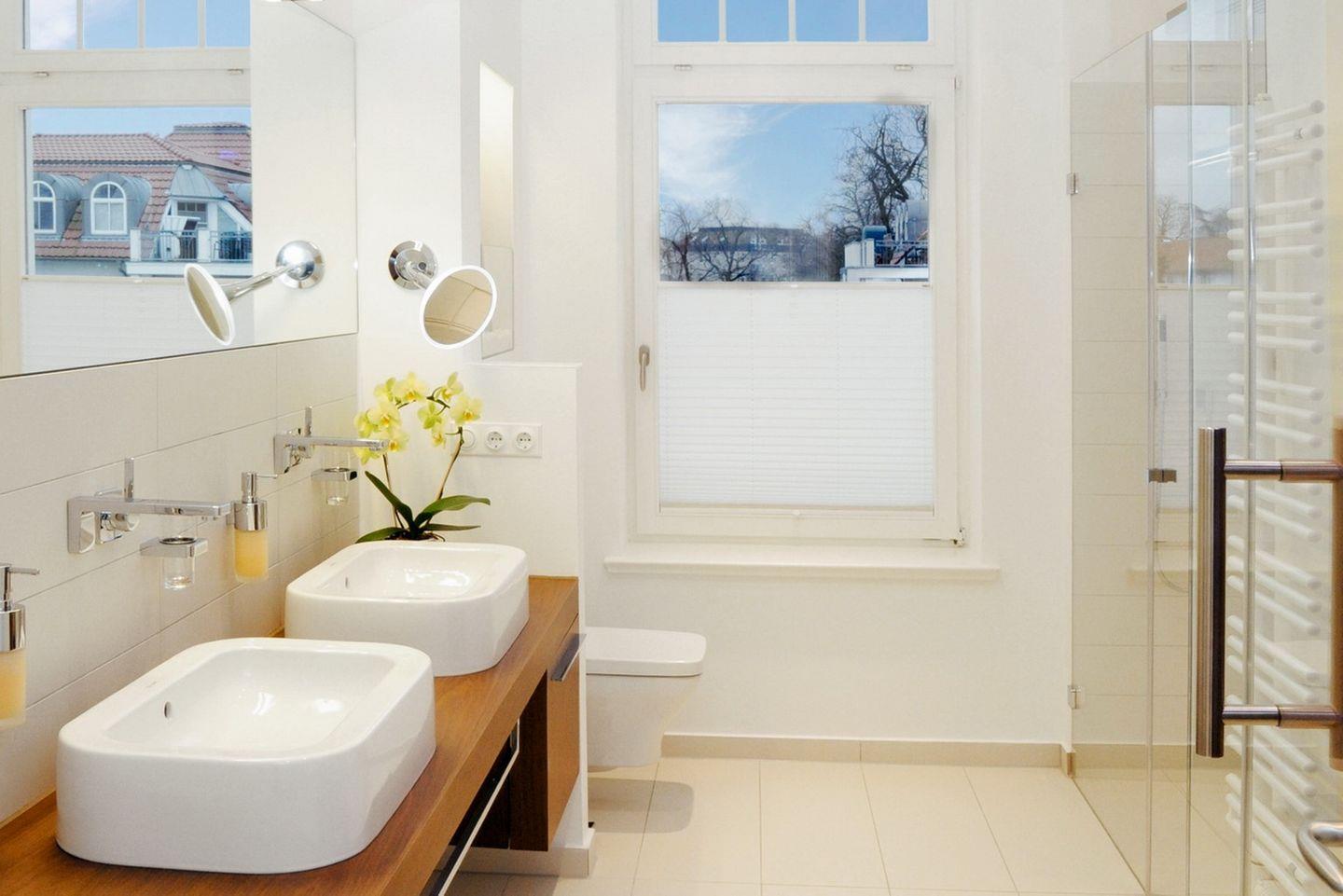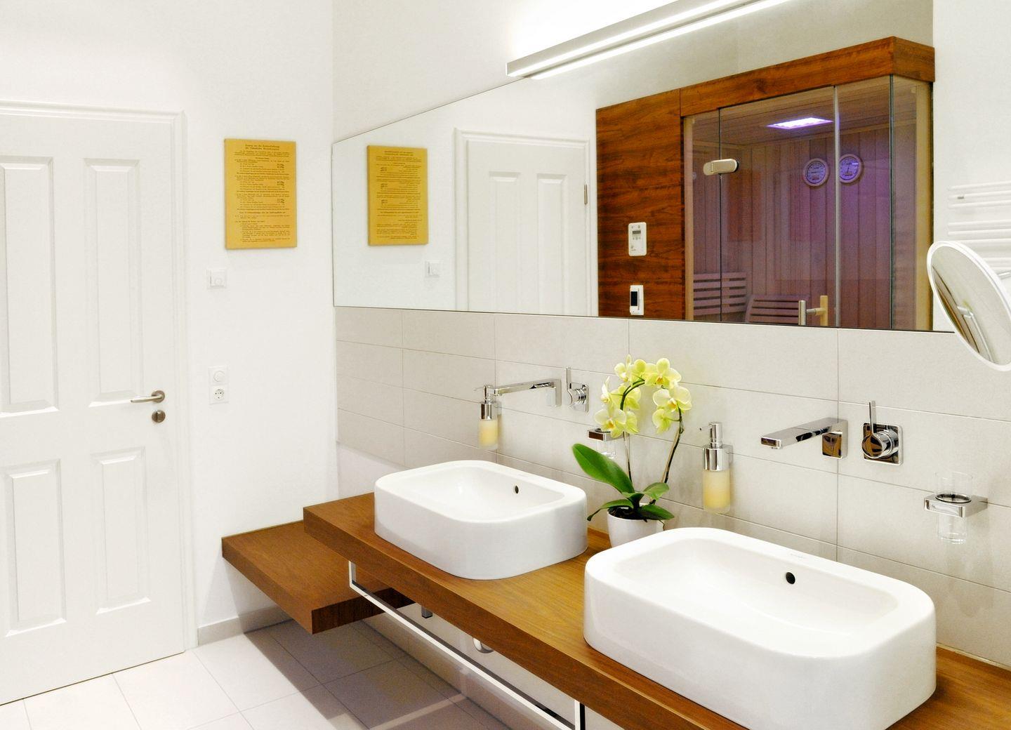 Das geflieste Tageslichtbad ist hell und modern gestaltet und verfügt über eine ebenerdige Dusche, ein WC, einen Waschtisch mit Doppelwaschbecken, einen großen beleuchteten Spiegel sowie einen Kosmetikspiegel und einen Föhn. Die Sauna ist im Badezimmer integriert.
