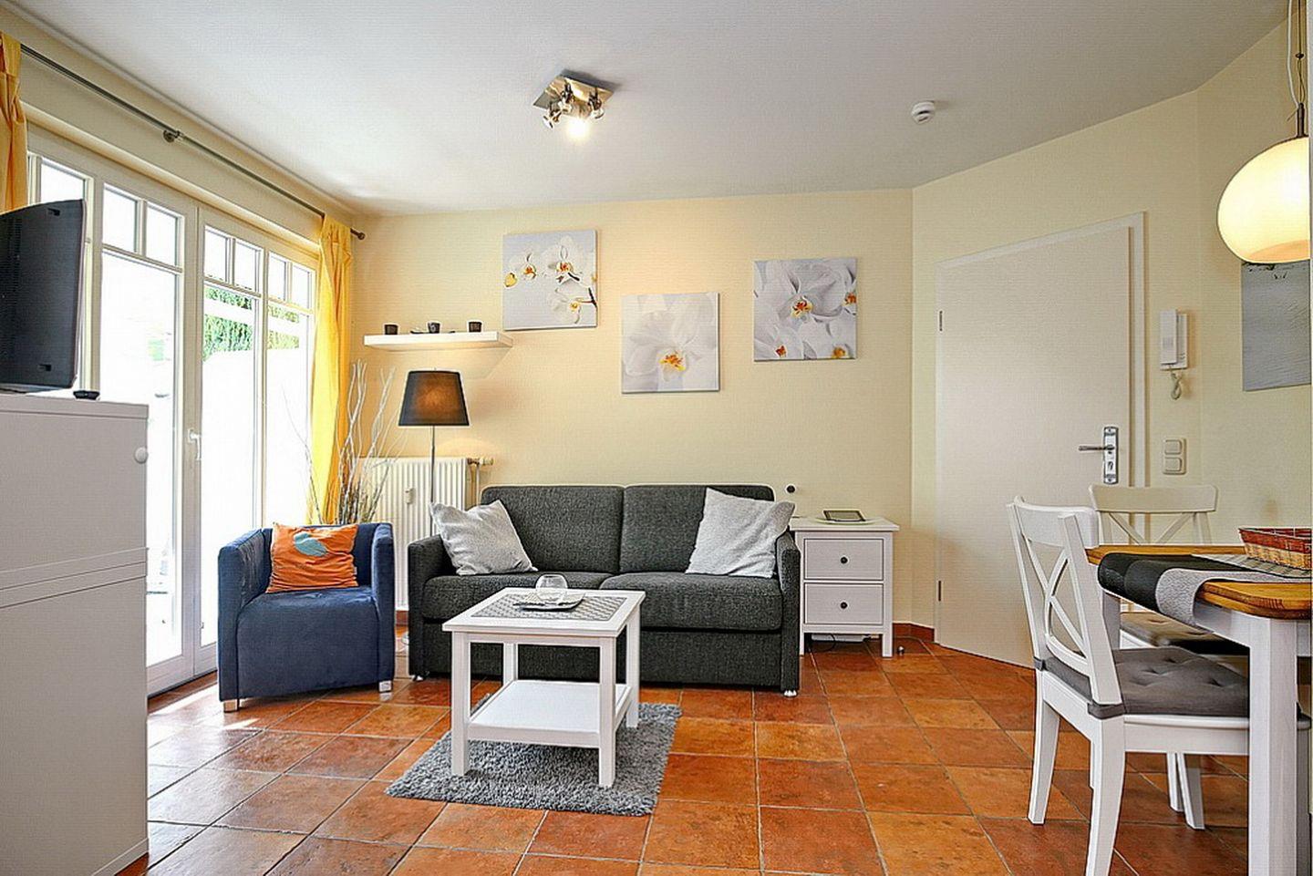 Im Wohnbereich findest du ein bequemes Sofa, einen Sessel, einen Couchtisch, eine Kommode mit einem Flachbild-TV und einem Radio vor. Von hier aus gelangst du auch auf die Terrasse der Ferienwohnung.