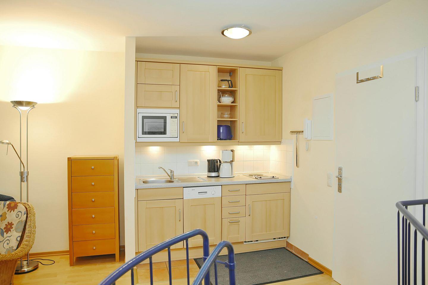 Die angrenzende Küchenzeile ist mit einem Geschirrspüler, einem 2-Platten-Kochfeld, einem Kühlschrank, einer Mikrowelle, einem Wasserkocher, einer Kaffeemaschine sowie einem Toaster ausgestattet. Des Weiteren stehen diverse Kochutensilien zur Verfügung.