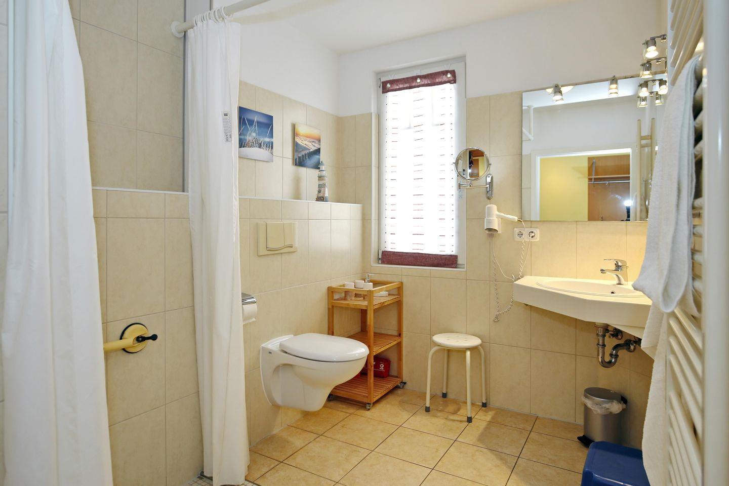 Das behindertenfreundliche Bad verfügt über ein unterfahrbares Waschbecken, eine Dusche mit geringer Einstiegshöhe sowie ein WC und einen Föhn. In der gesamten Ferienwohnung sind Feinsteinfliesen verlegt. Es handelt sich um eine Nichtraucherwohnung. Haustiere sind hier nicht gewünscht.