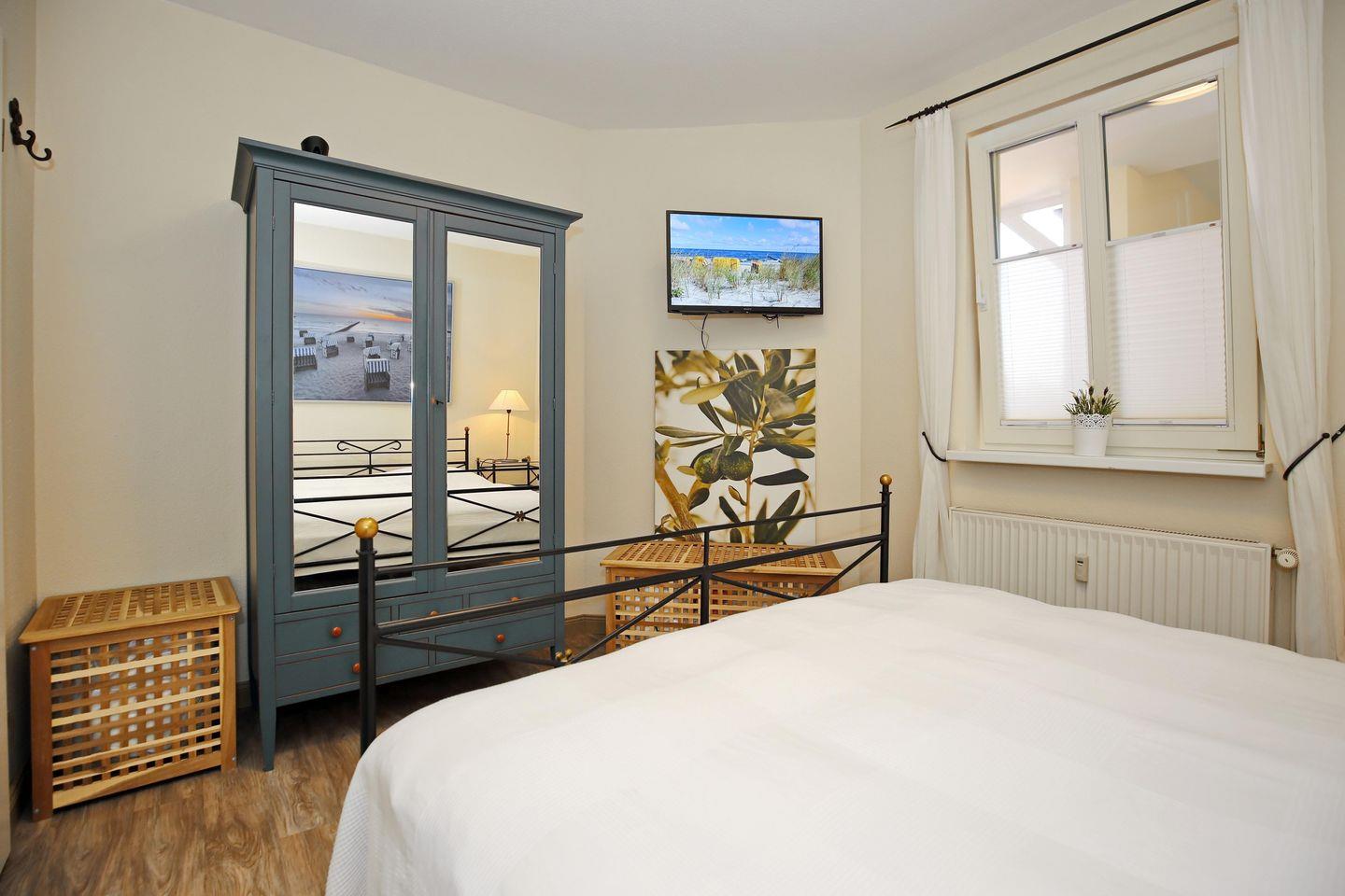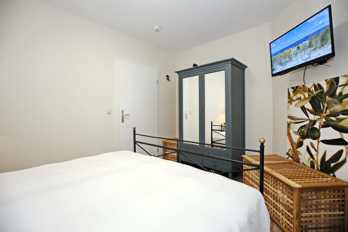 Die Wohnung ist im Schlafzimmer mit einem Doppelbett (2 x 80 x 200 cm) und einem Kleiderschrank ausgestattet. Außerdem gibt es hier einen zweiten Fernseher. Als Verdunklungsmöglichkeit befinden sich sowohl Vorhänge als auch Plissees an den Fenstern.