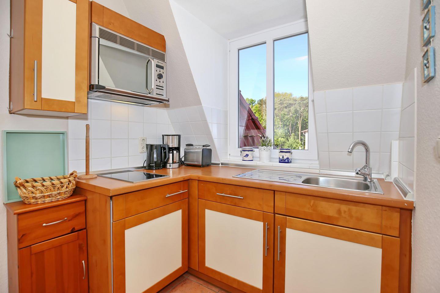 In der integrierten Küchenzeile stehen dir ein 2-Platten-Cerankochfeld, eine Mikrowelle, ein Kühlschrank mit Gefrierfach, eine Kaffeemaschine, ein Wasserkocher und ein Toaster zur Verfügung. Am Esstisch kannst du deine gemeinsamen Mahlzeiten in der Ferienwohnung genießen.