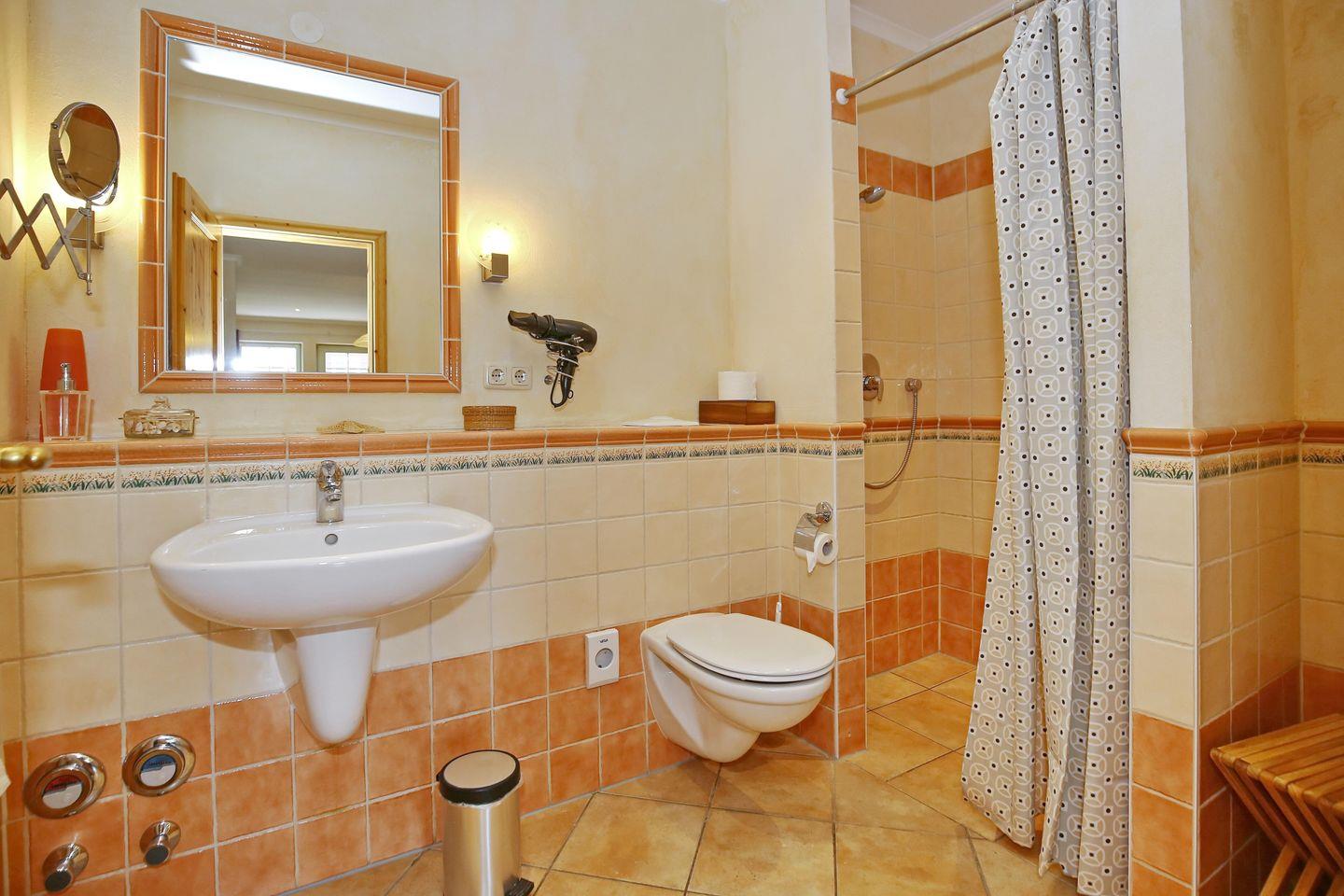 Das Badezimmer verfügt über eine ebenerdige Dusche, ein Waschbecken, ein WC und einen Spiegel. Die komplette Ferienwohnung wurde mit Fliesen verlegt.