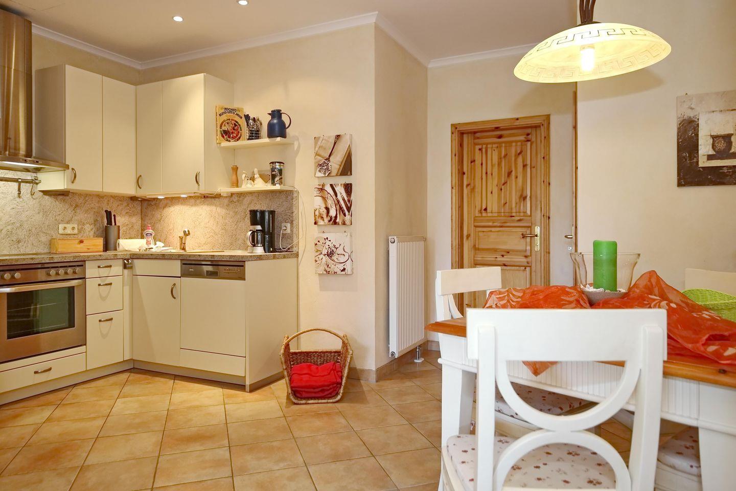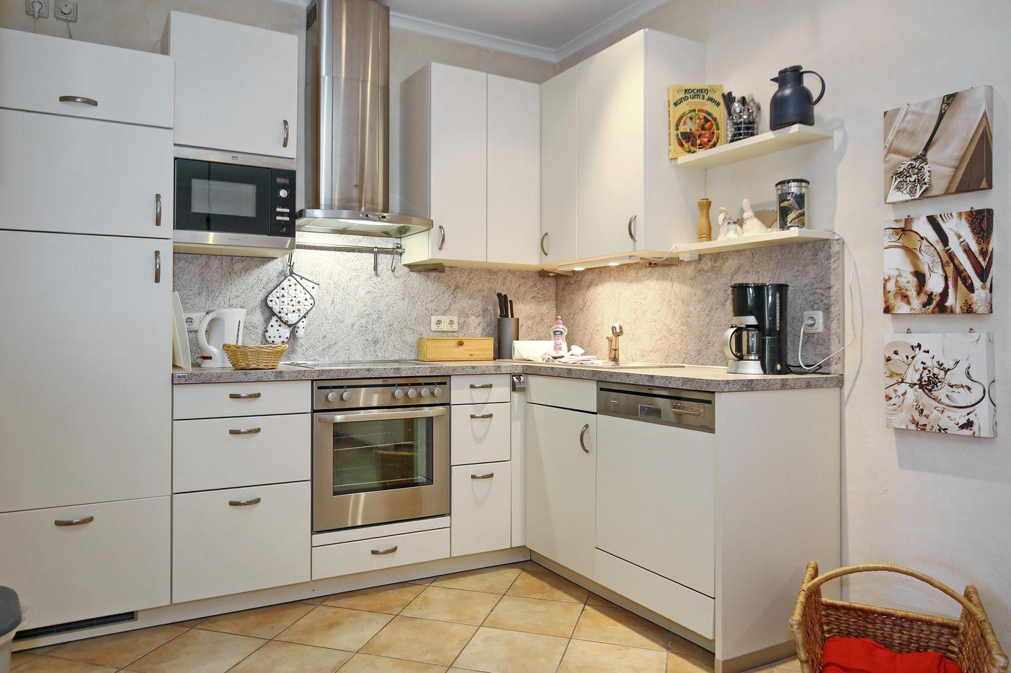 In der gut ausgestatteten Küchenzeile stehen neben einem Backofen, ein 4-Zonen-Cerankochfeld, eine Mikrowelle, ein Geschirrspüler, ein Wasserkocher, ein Toaster und eine Kaffeemaschine diverse Kochutensilien zur Verfügung.