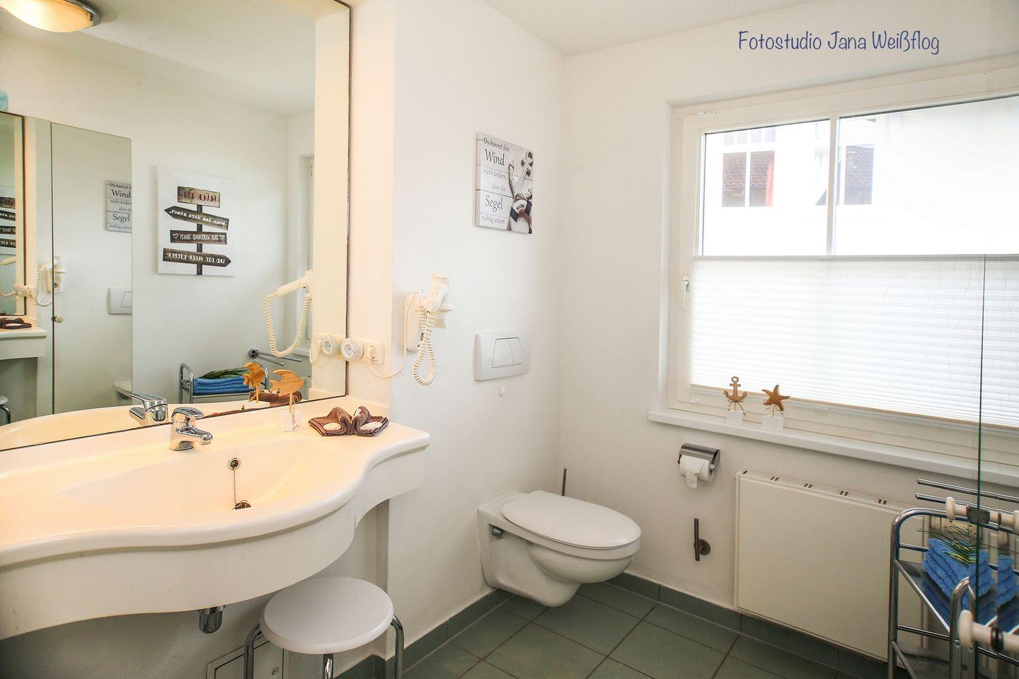 Das großzügige Duschbad mit Fenster ist mit WC, Waschtisch, Kosmetikspiegel und Fön gut ausgestattet. Im Wohnbereich wurde Vinyl verlegt. Ausnahme sind die Schlafzimmer der Ferienwohnung. Hier findest du einen Laminatboden.