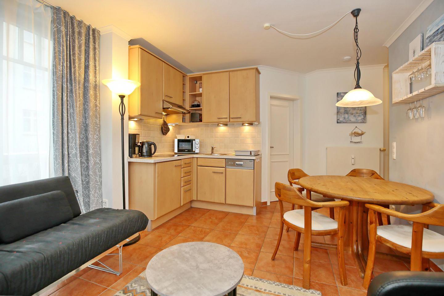 Die angrenzende Küchenzeile ist für dich mit einem 4-Platten-Cerankochfeld, einem Kühlschrank mit Gefrierfach, einem Geschirrspüler und einer Mikrowelle ausgestattet. Nützliche Kleingeräte wie eine Kaffeemaschine, ein Toaster und ein Wasserkocher komplettieren die Kücheneinrichtung.