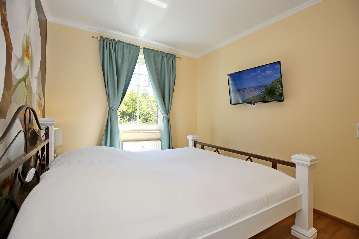 Das angrenzende Schlafzimmer ist ausgestattet mit einem großen Doppelbett (2 x 90 x 200 cm) mit einer Sitzhöhe von ca. 44 cm, einem Kleiderschrank und einem Flachbild-TV.