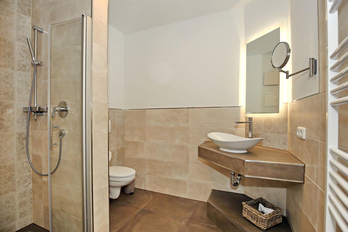 Im neu gestalteten Badezimmer findest du eine bodenebene Dusche, ein WC, einen Waschtisch, einen Kosmetikspiegel und einen Föhn.