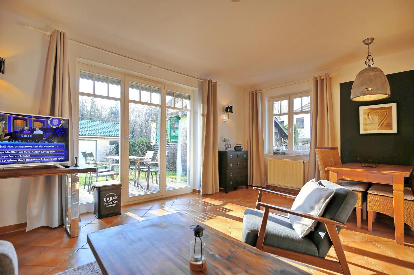 Die helle 2-Zimmer-Ferienwohnung befindet sich im Erdgeschoss auf der Südseite des Hauses Seepferdchen und wurde im Jahr 2020 komplett modernisiert. Die Wohnung bietet auf 52 m² bis zu 3 Personen Platz für einen erholsamen Urlaub und gliedert sich für dich in einen Wohn- und Essbereich, eine Küchenzeile sowie ein Schlafzimmer und ein Wannenbad. Auf der Terrasse mit Garten kannst du in aller Ruhe den Tag ausklingen lassen und den Waldblick genießen!
