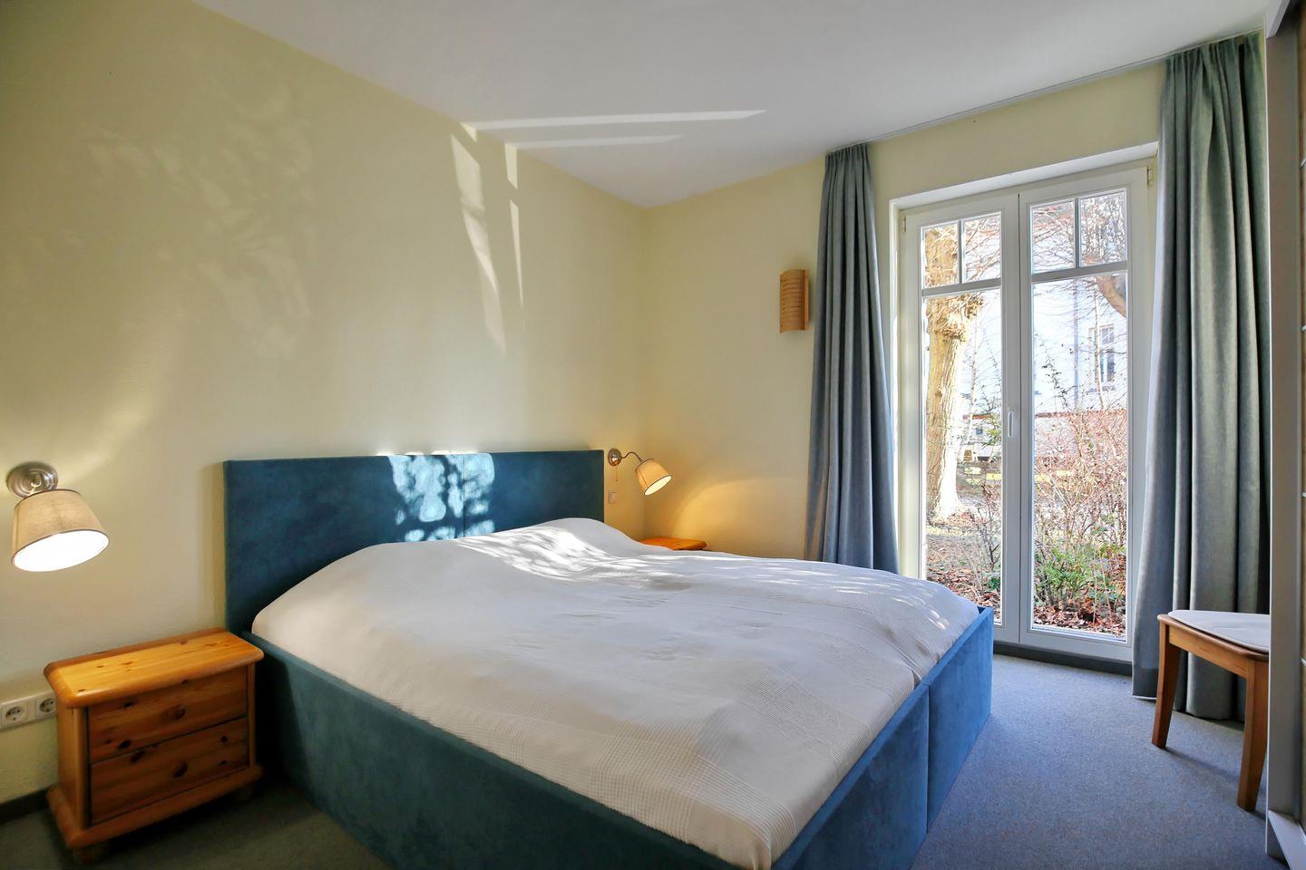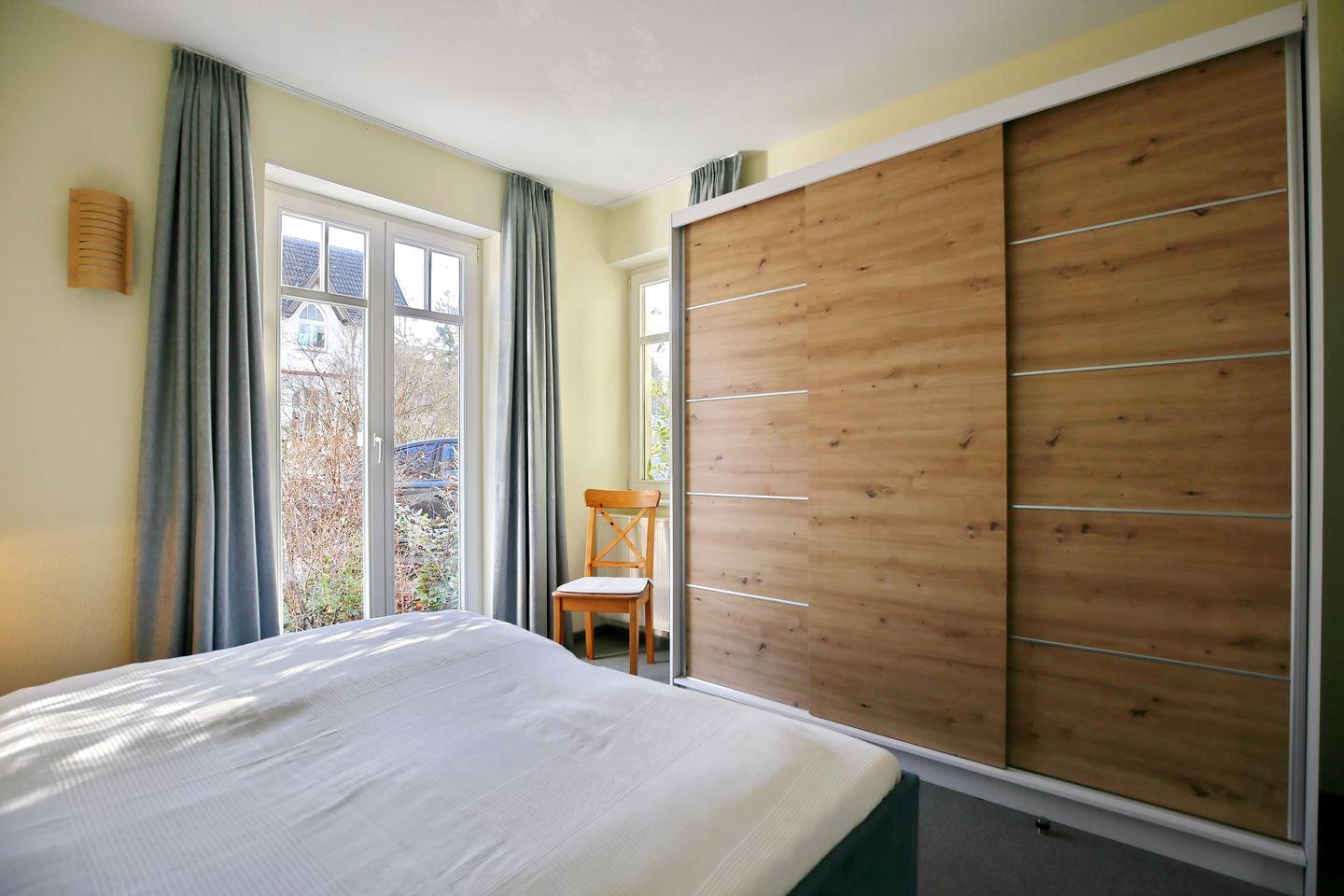 Im Schlafzimmer der Ferienwohnung erwarten dich ein Doppelbett (2x90 x 200 cm) und ein Kleiderschrank, der dir Stauraum für deine Urlaubskleidung bietet. Elektrische Rollläden dienen dir als Sichtschutz oder zum Verdunkeln.