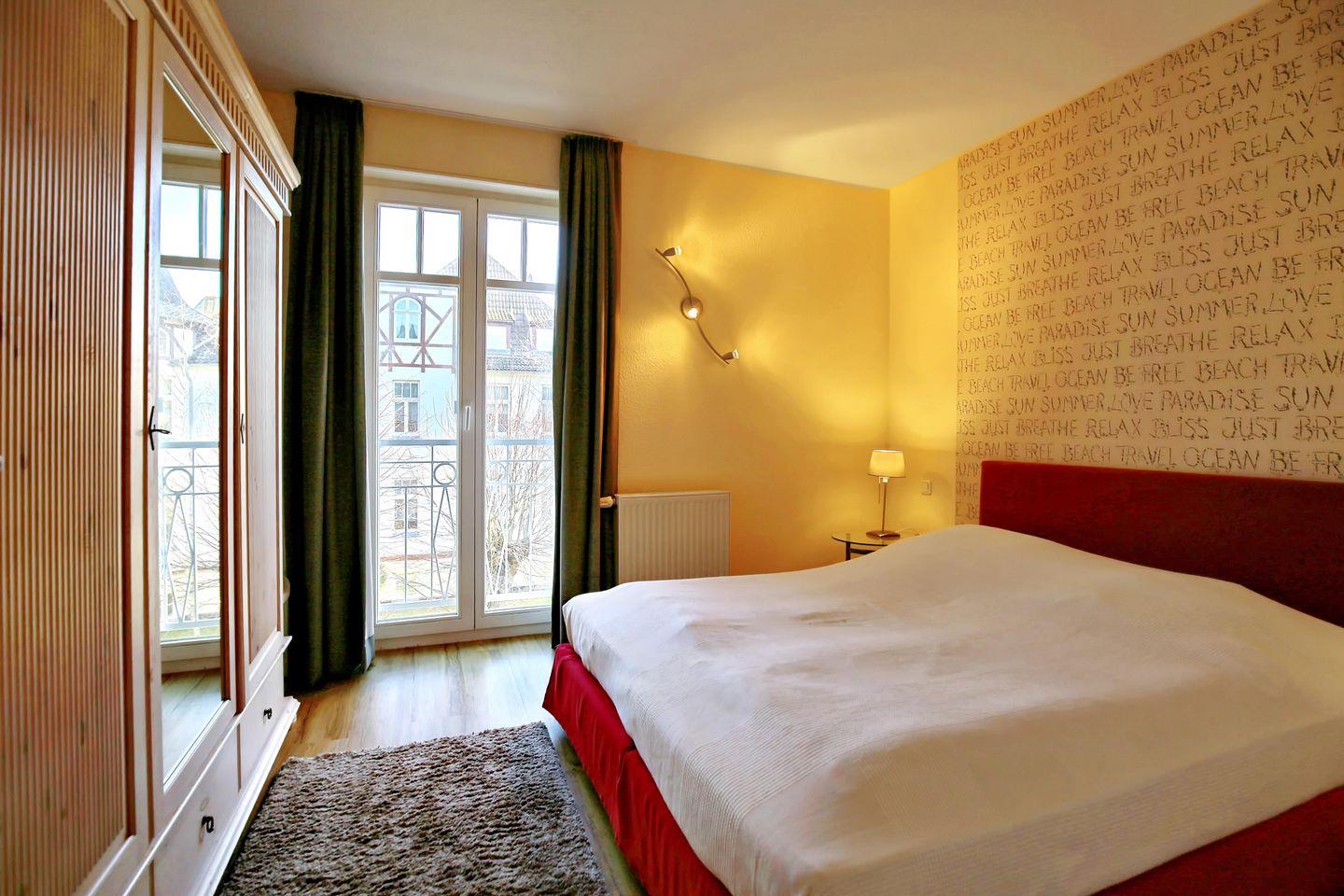 Im Schlafzimmer der Ferienwohnung erwarten dich ein Doppelbett mit 2 Matratzen (80 x 200 cm) und ein großer Kleiderschrank, der dir ausreichend Stauraum für deine Urlaubskleidung bietet. Vorhänge dienen dir als Sichtschutz oder zum Verdunkeln.